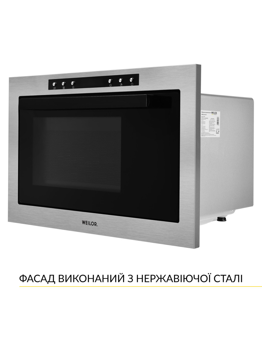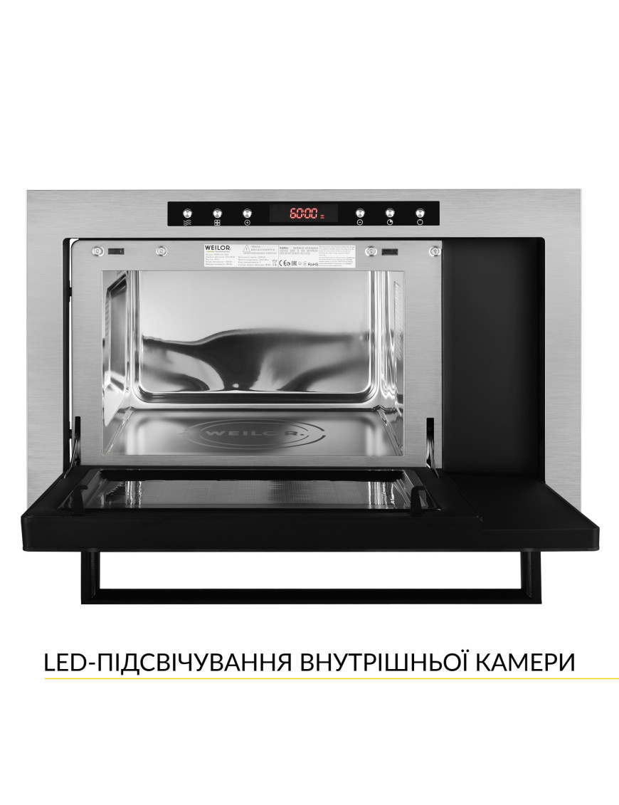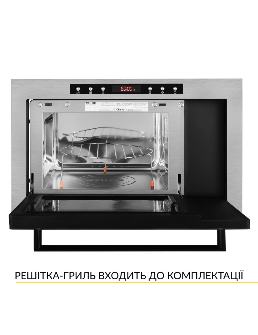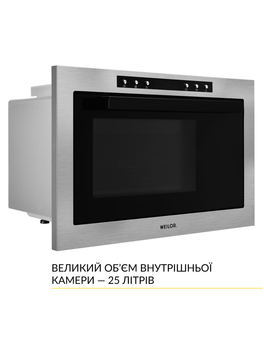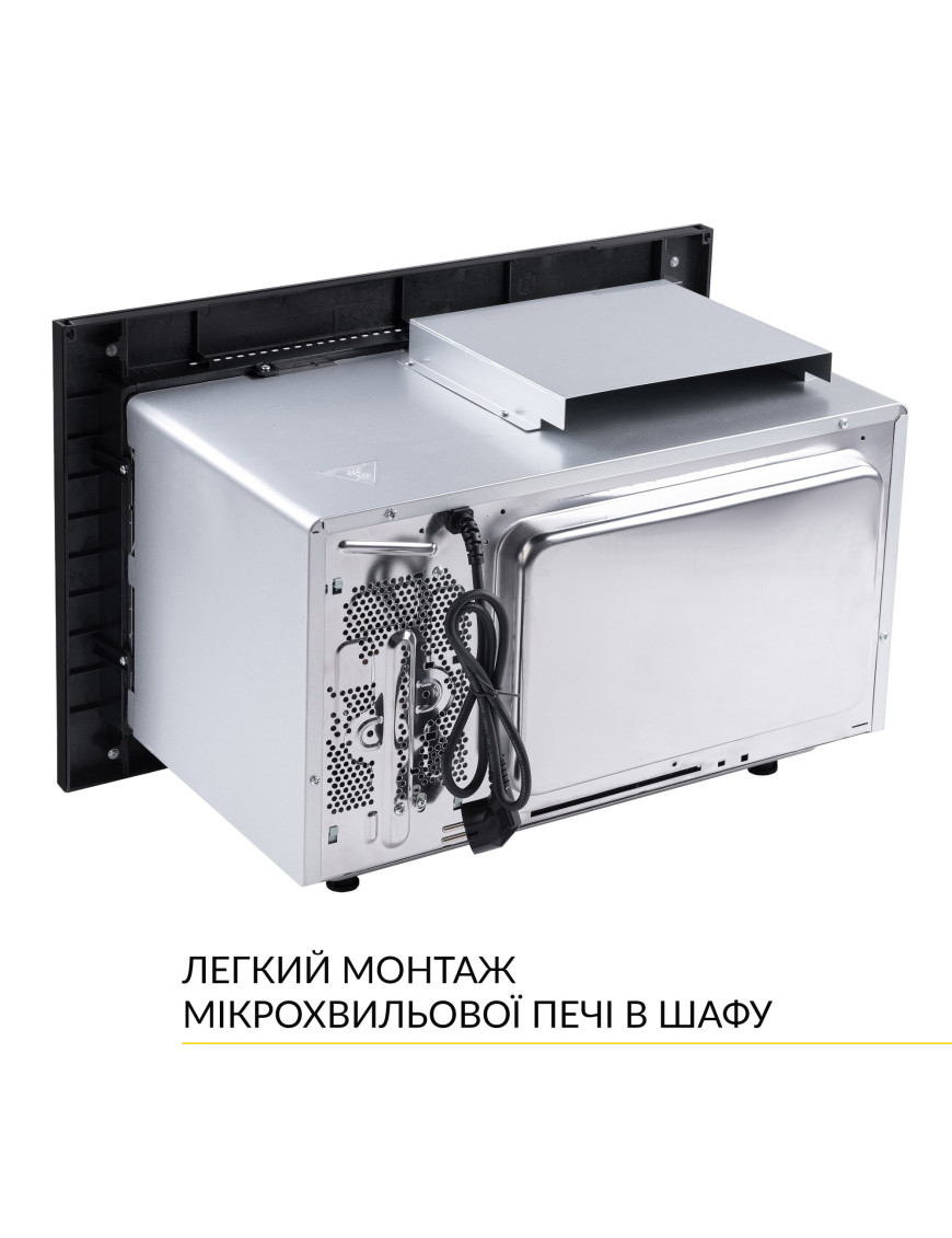 Повновбудована мікрохвильова піч, потожністю 900 Вт, потужність грилю 1200 Вт. Ширина 592 мм. Внутрішній об"єм 25 л. Колір нержавіюча сталь. Матеріал фронтальної панелі - чорне загартоване скло і нержавіюча сталь. Управління - електронне з LED дисплеєм з червоною підсвіткою. Освітлення камери- 1*1 Вт LED. 5 рівнів потужності, 6 автоматичних меню приготування, 2 режими грилю, 2 режими комбі. Відкривання дверцят - механічна ручка. Система рівномірного розподілення мікрохвиль - брендована керамічна пластина. Комплектація: мікрохвильова піч, шнур з вилкою, інструкція, гарантійний талон, книга фірмових рецептів, решітка-гриль, мікрофібра для догляду за мікрохвильовою піччю.