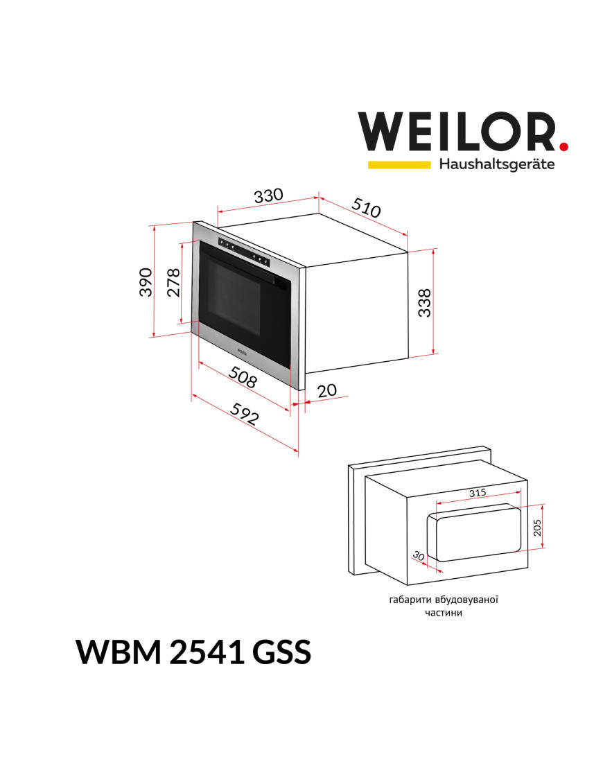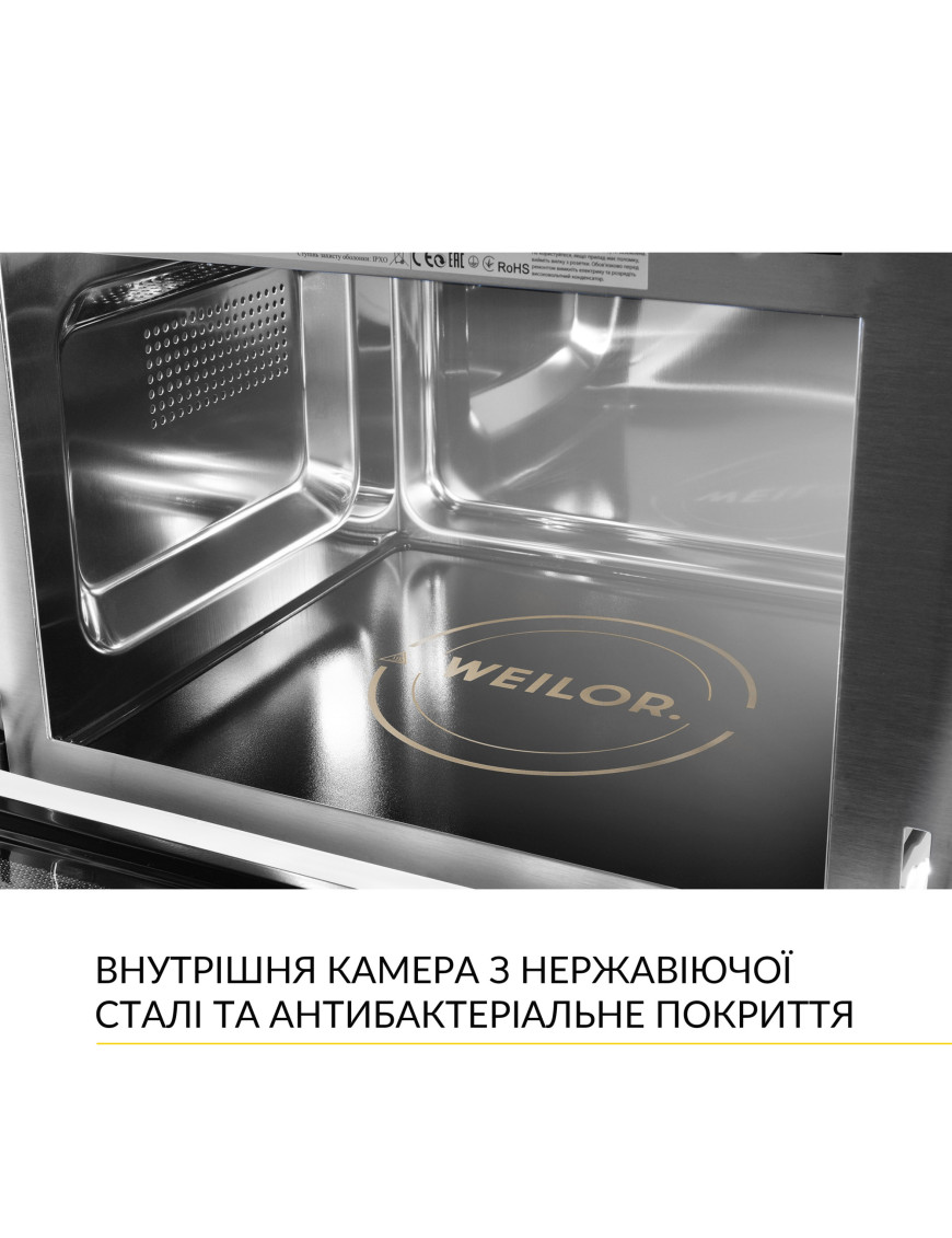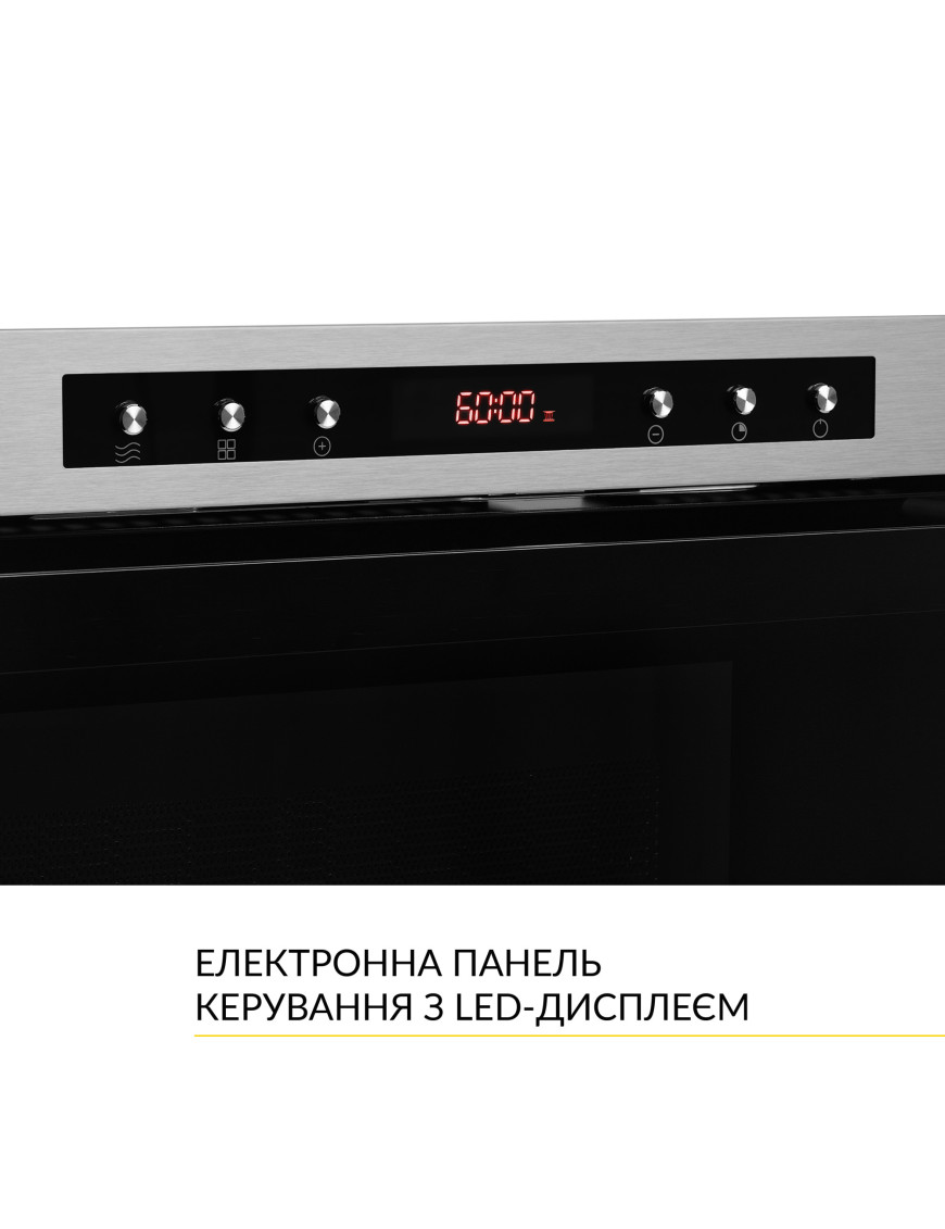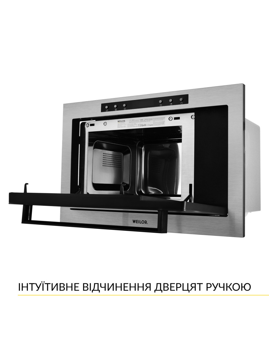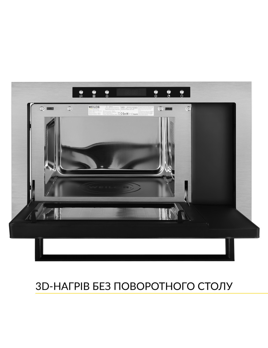 Повновбудована мікрохвильова піч, потожністю 900 Вт, потужність грилю 1200 Вт. Ширина 592 мм. Внутрішній об"єм 25 л. Колір нержавіюча сталь. Матеріал фронтальної панелі - чорне загартоване скло і нержавіюча сталь. Управління - електронне з LED дисплеєм з червоною підсвіткою. Освітлення камери- 1*1 Вт LED. 5 рівнів потужності, 6 автоматичних меню приготування, 2 режими грилю, 2 режими комбі. Відкривання дверцят - механічна ручка. Система рівномірного розподілення мікрохвиль - брендована керамічна пластина. Комплектація: мікрохвильова піч, шнур з вилкою, інструкція, гарантійний талон, книга фірмових рецептів, решітка-гриль, мікрофібра для догляду за мікрохвильовою піччю.
