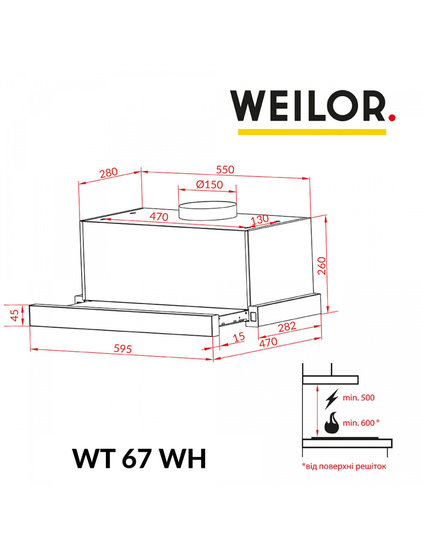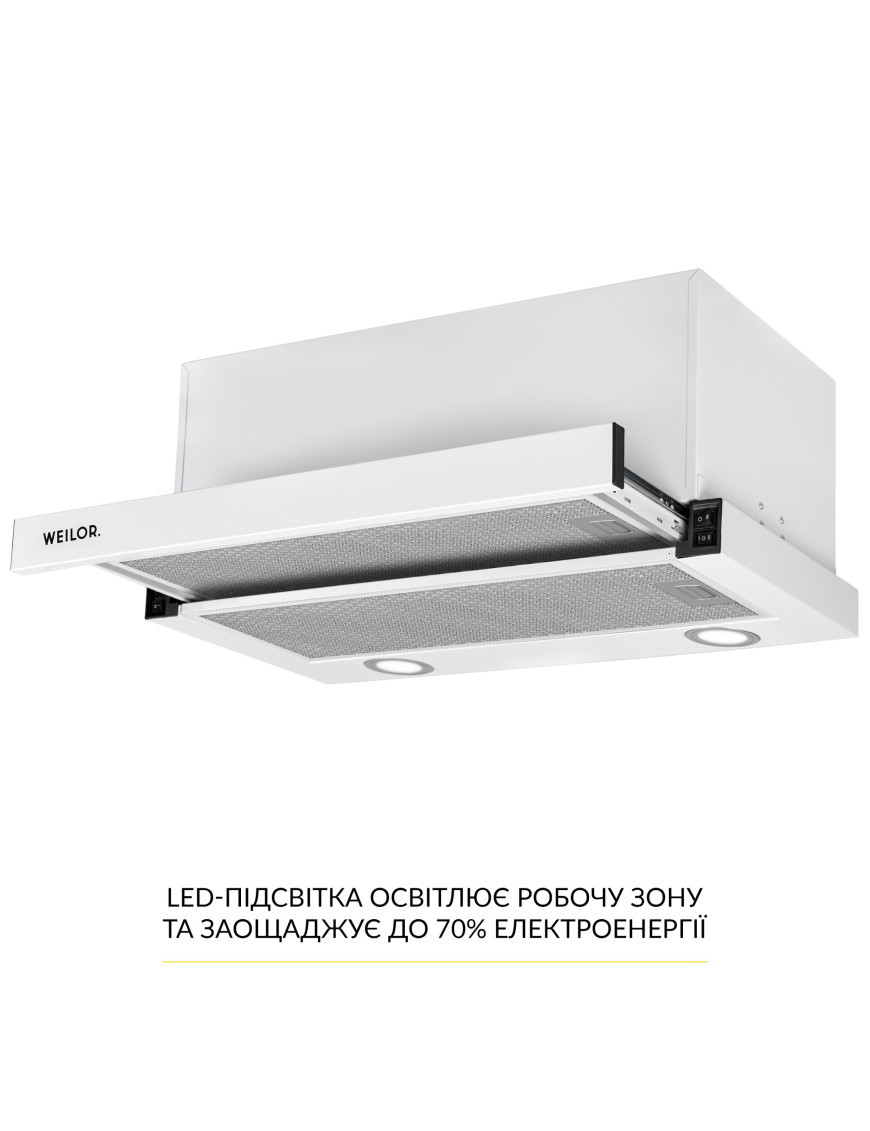 Благодаря великолепной эргономике, которой наделена вытяжка WEILOR WT 67 WH, она подойдет к любой кухне. Дизайн телескопических вытяжек привлекателен за счет простоты и лаконичности. Вытяжка данной модели придаст элегантности вашему интерьеру, а также некоторой утонченности и стиля. Практически весь корпус телескопической вытяжки спрятан внутри навесного модуля, а на виду остается только декоративная выдвижная панель.