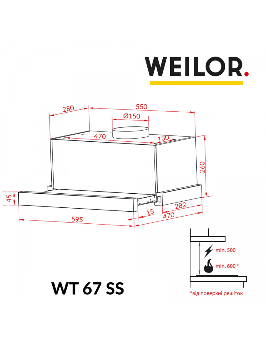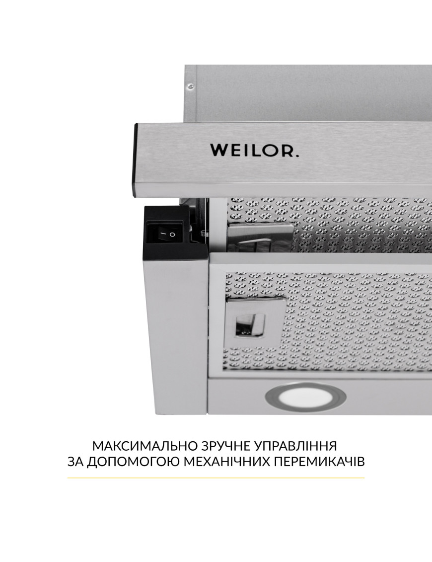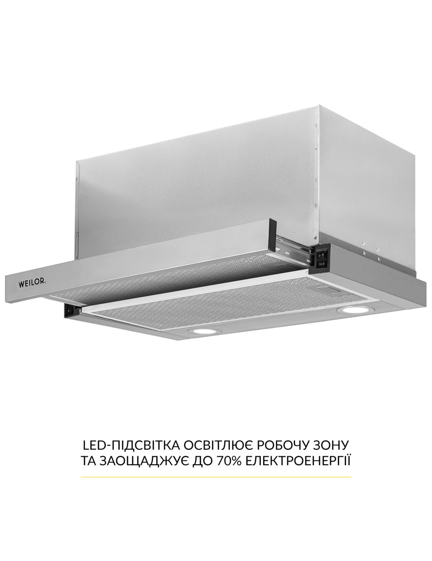 Благодаря великолепной эргономике, которой наделена вытяжка WEILOR WT 67 SS, она подойдет к любой кухне. Дизайн телескопических вытяжек привлекателен за счет простоты и лаконичности. Вытяжка данной модели придаст элегантности вашему интерьеру, а также некоторой утонченности и стиля. Практически весь корпус телескопической вытяжки спрятан внутри навесного модуля, а на виду остается только декоративная выдвижная панель.