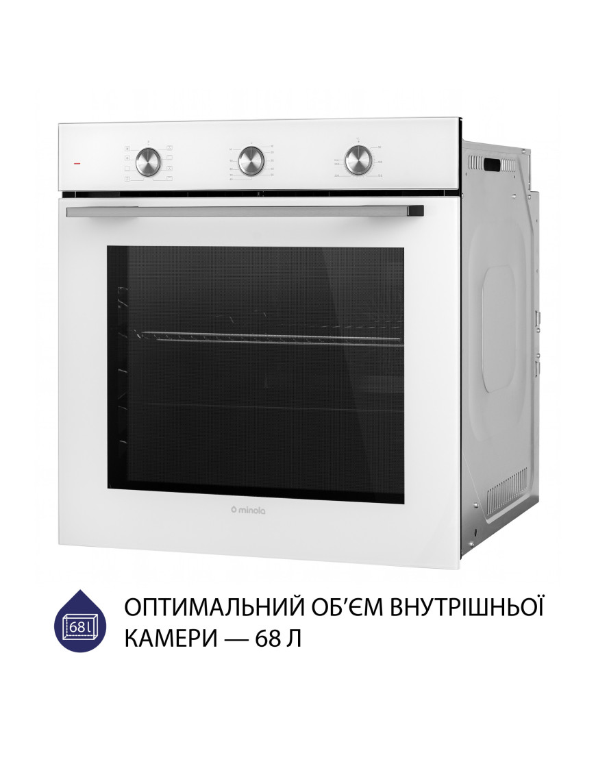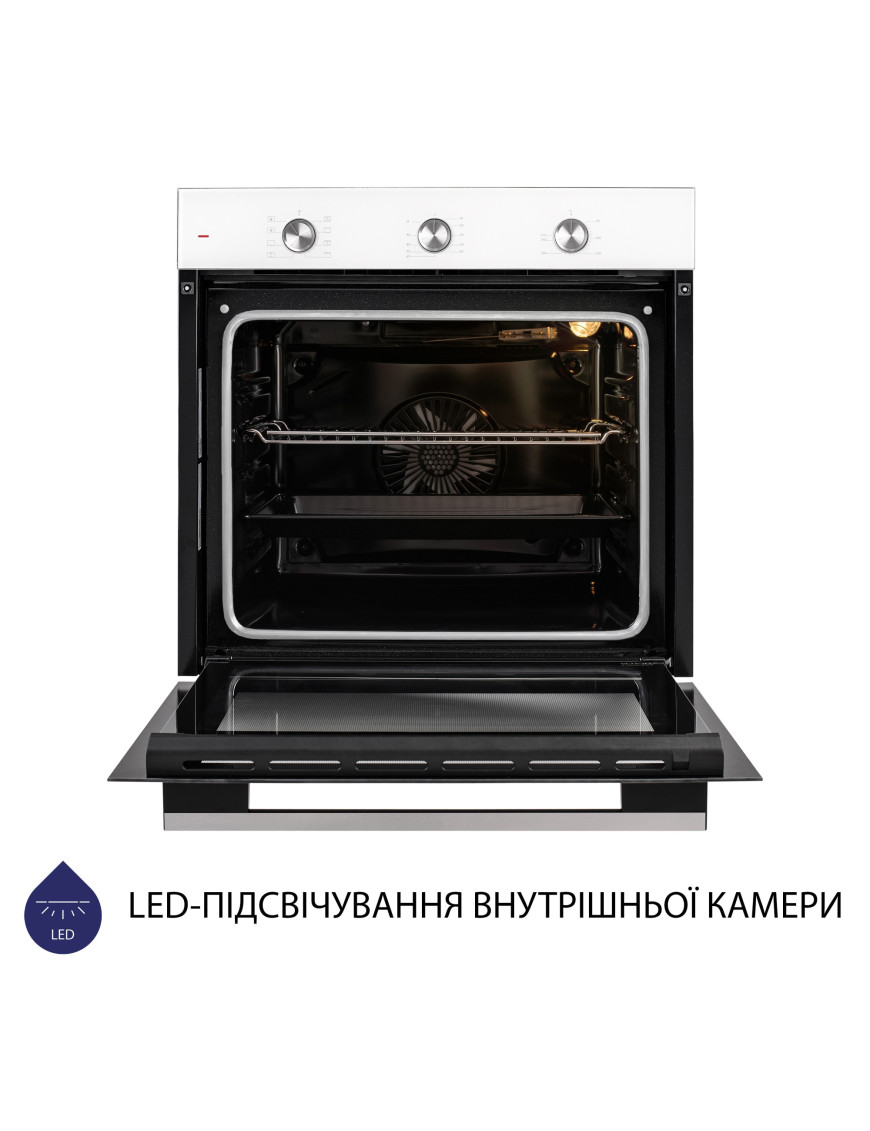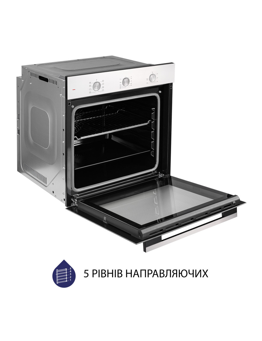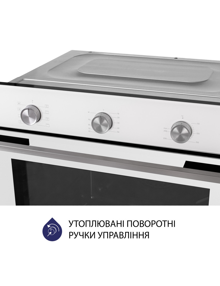 Вбудована електрична духова шафа • Ширина(мм): 600 • Колір: Білий • Керування: Механічне (утоплюючі ручки управління) • К-сть програм: 8 • Об'єм(л): 68 • Матеріал панелі керув.: Скло • Матеріал дверцят духовки: Скло • Тип направляючих: Рельєфні • К-сть рівнів направляючих: 5 • Внутрішнє покриття: Антипригарна емаль легкого очищення чорного кольору • Функції: Гриль, Конвекція, Розморожування, Підсвічування внутрішньої камери, Знімне скло • Тип/ Потужність гриля(Вт): Електричний/ 2450 • Система очищення: Традиційна • Таймер: Механічний (90хв.) • Клас енергоспоживання: А • Максимальна/ мінімальна температура нагріву: 250 °С / 50 °С • Комплектація: Універсальне деко. Решітка. Монтажний комплект. Інструкція з експлуатації. Гарантійний талон. Мікрофіша. Енергокарта. • Кабель живлення з вилкою: Так • Підключення до електромережі: 220-240 В • Розміри духової шафи(мм)(ШхВхГ): 595х595х547 • Розмір упаковки(мм)(ШхВхГ): 650х660х670¶