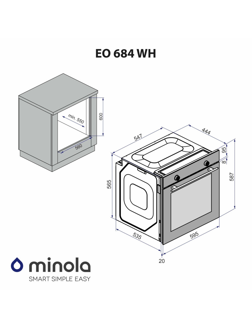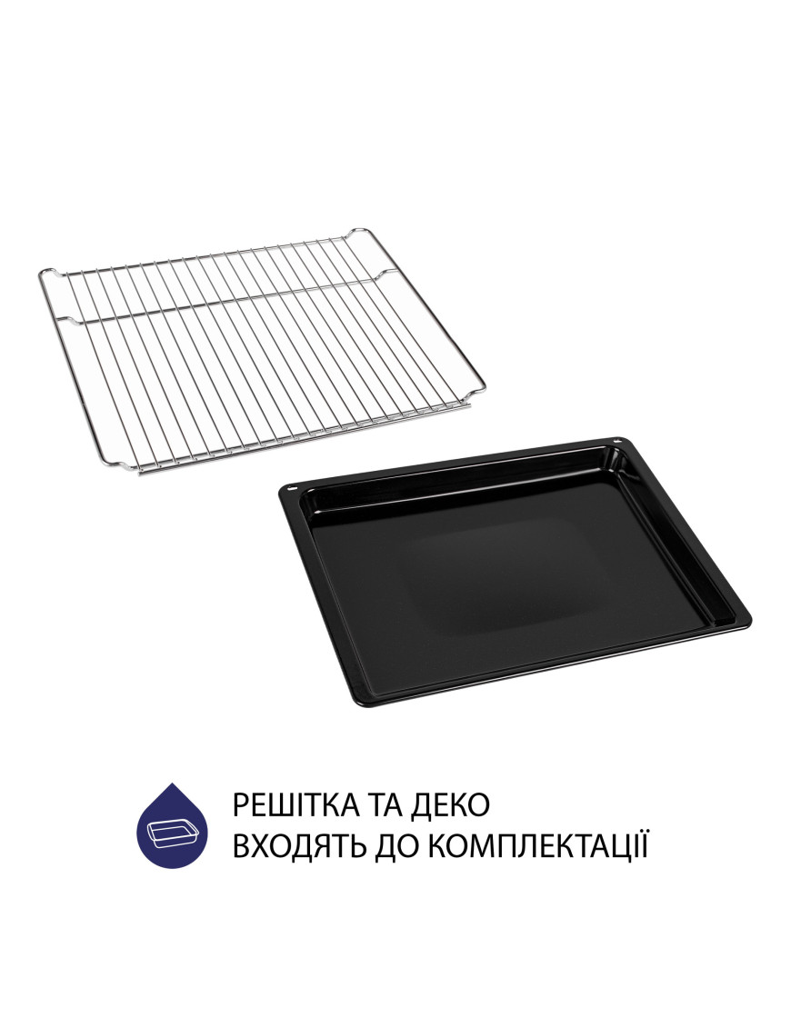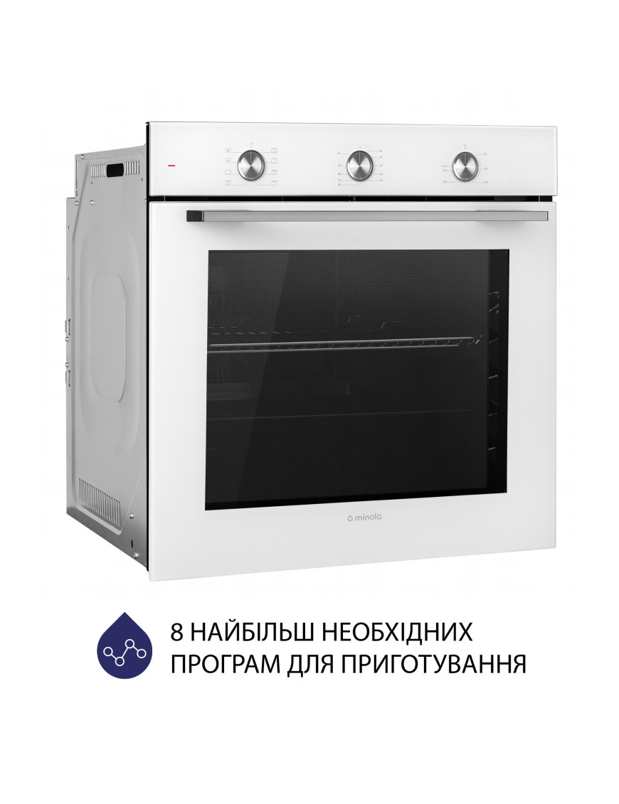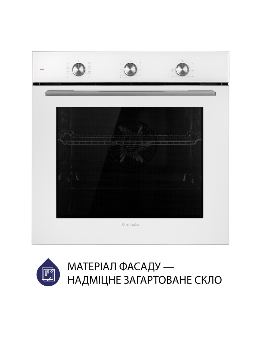 Вбудована електрична духова шафа • Ширина(мм): 600 • Колір: Білий • Керування: Механічне (утоплюючі ручки управління) • К-сть програм: 8 • Об'єм(л): 68 • Матеріал панелі керув.: Скло • Матеріал дверцят духовки: Скло • Тип направляючих: Рельєфні • К-сть рівнів направляючих: 5 • Внутрішнє покриття: Антипригарна емаль легкого очищення чорного кольору • Функції: Гриль, Конвекція, Розморожування, Підсвічування внутрішньої камери, Знімне скло • Тип/ Потужність гриля(Вт): Електричний/ 2450 • Система очищення: Традиційна • Таймер: Механічний (90хв.) • Клас енергоспоживання: А • Максимальна/ мінімальна температура нагріву: 250 °С / 50 °С • Комплектація: Універсальне деко. Решітка. Монтажний комплект. Інструкція з експлуатації. Гарантійний талон. Мікрофіша. Енергокарта. • Кабель живлення з вилкою: Так • Підключення до електромережі: 220-240 В • Розміри духової шафи(мм)(ШхВхГ): 595х595х547 • Розмір упаковки(мм)(ШхВхГ): 650х660х670¶