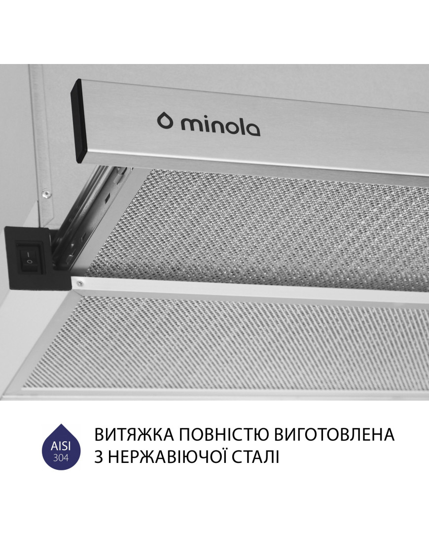 Кухонная вытяжка Minola HTL 5714 I 1100 LED изготовлена из нержавеющей стали. Это делает данную модель вытяжки идеально подходящей для вашей кухни. Механический переключатель управления расположен сбоку. На нем находятся кнопки переключения скоростей и включения/выключения освещения.