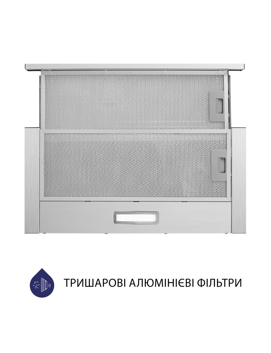 Кухонная вытяжка Minola HTL 614 I LED оборудована двумя алюминиевыми жировыми фильтрами, состоящими из трех слоев. Они обеспечивают надежную защиту двигателя и других деталей устройства от попадания жира и испарений.
