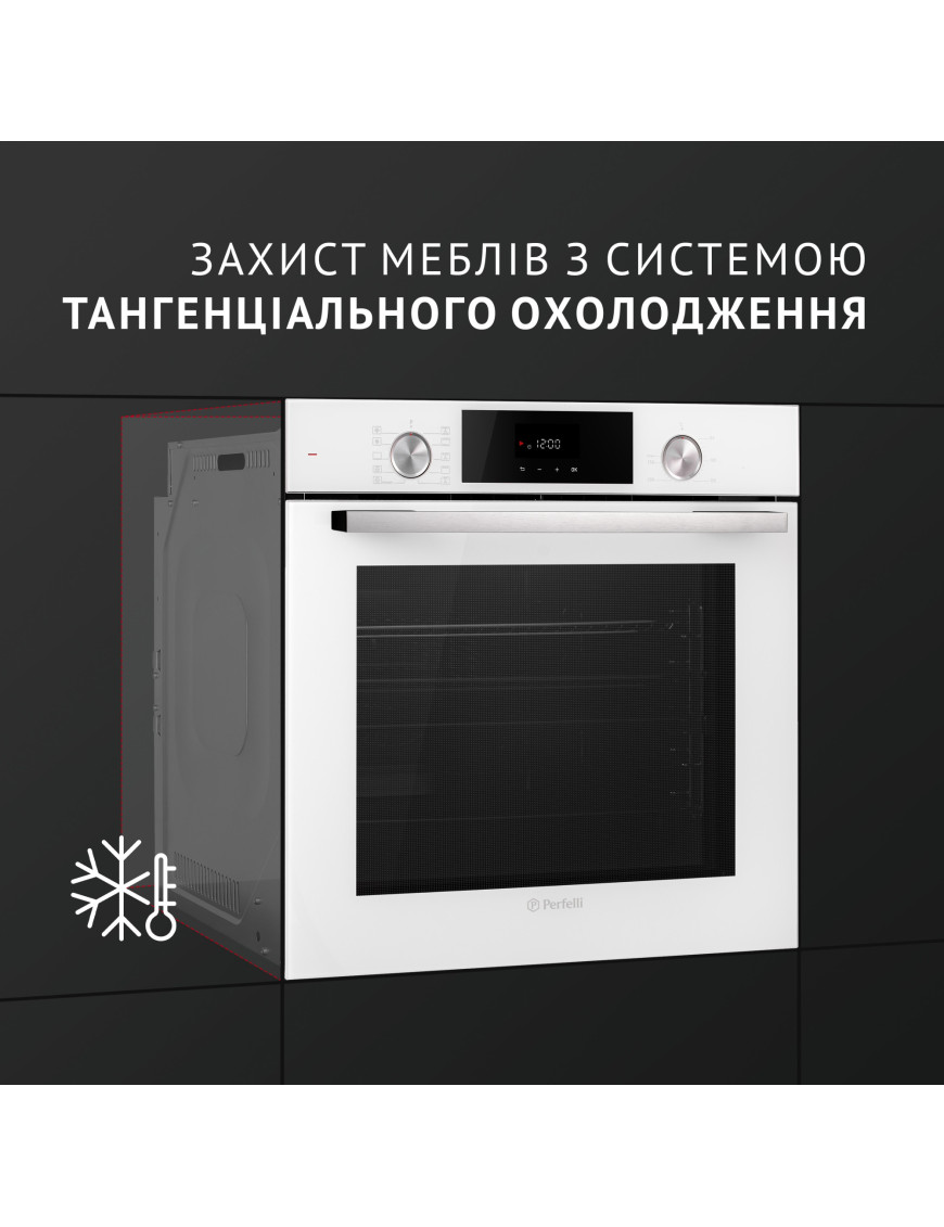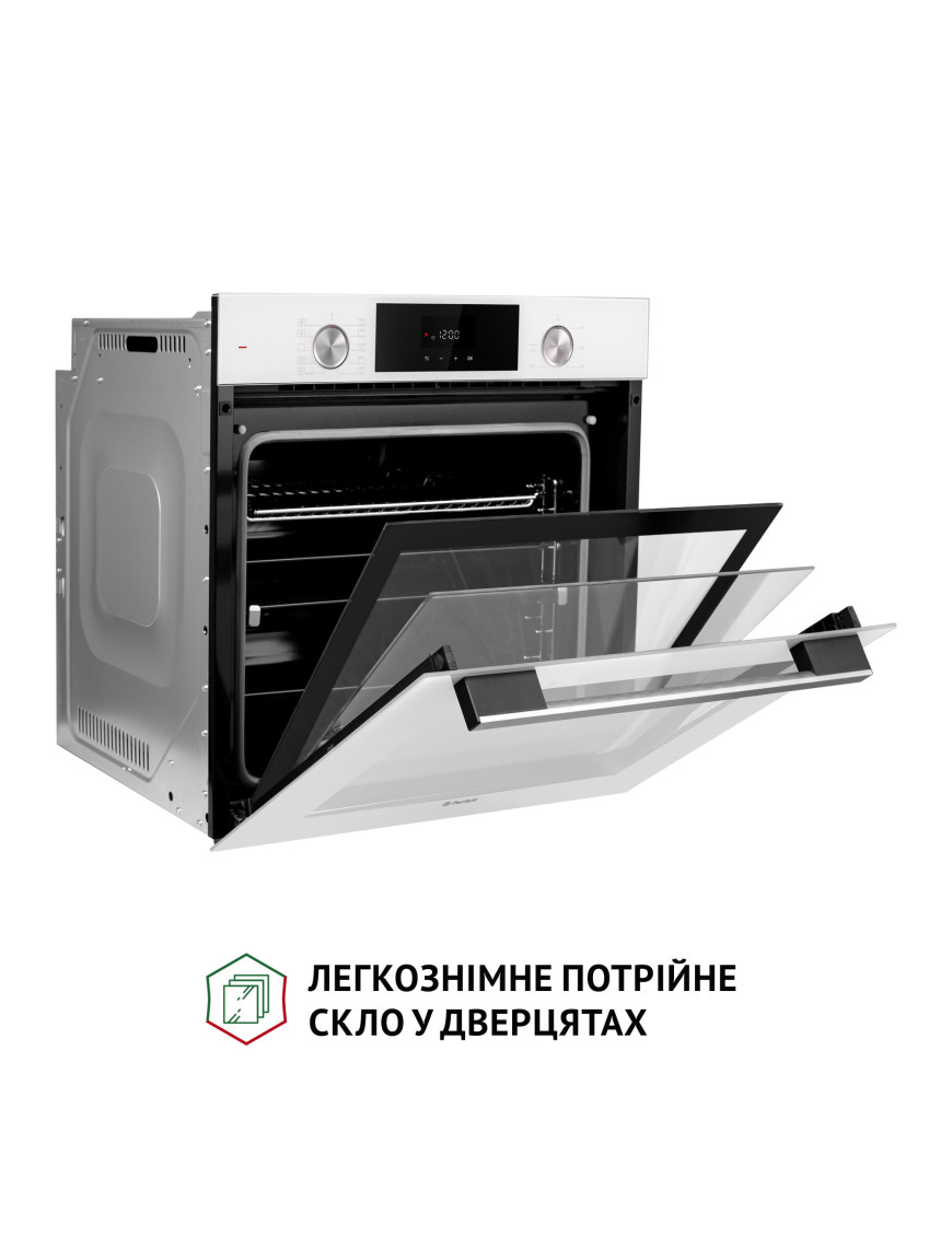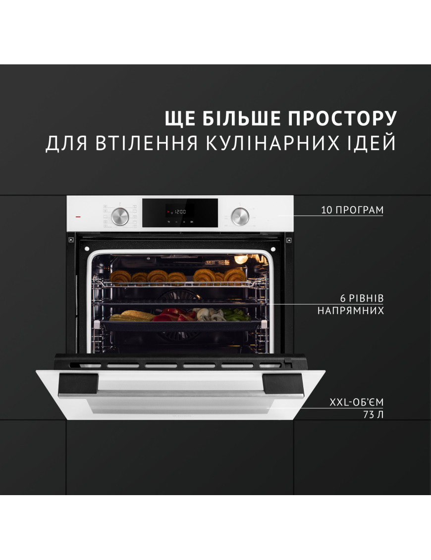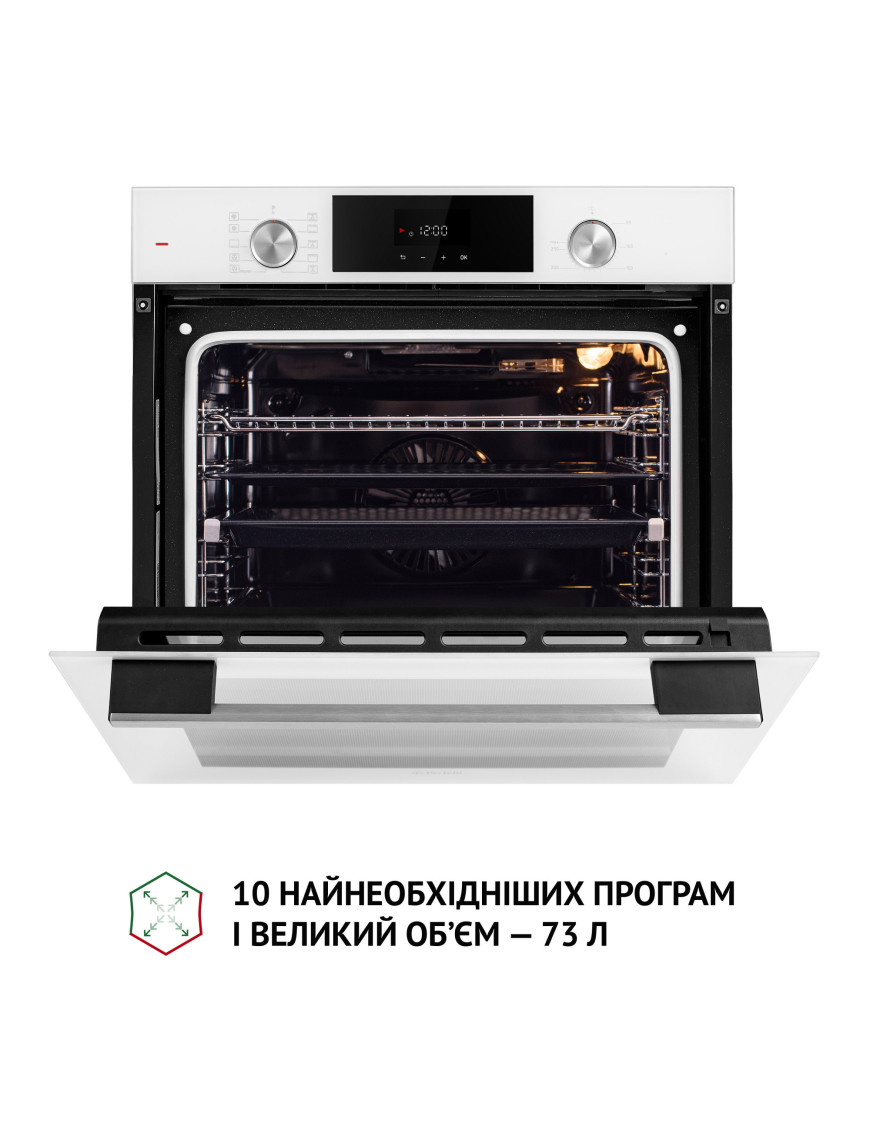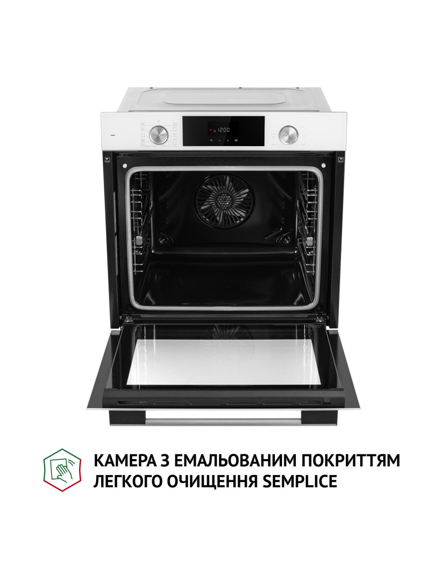 Вбудована електрична духова шафа • Ширина(мм): 600 • Колір: Білий • Керування: Утоплюючі ручки управління + LED white дисплей• К-сть програм: 10 • Об'єм(л): 73 • Матеріал панелі керув.: Скло • Матеріал дверцят духовки: Скло SCHOTT • Тип направляючих: Хромовані знімні+ 1-рівень телескопічних напрямних • К-сть рівнів направляючих: 6 • Внутрішнє покриття: Антипригарна емаль легкого очищення Semplice • Режими приготування: Підсвічування внутрішньої камери; Розморожування; Нижній нагрів; Нижній нагрів+ Кільцевий нагрів + Вентилятор; Кільцевий нагрів + Вентилятор (FryArt); Малий гриль+ вентилятор; Гриль; Гриль + вентилятор; Статичний нагрів (верхній і нижній нагрів); Статичний нагрів + Вентилятор • Функції: Підсвічування внутрішньої камери, Знімне скло, Знімні направляючі, Функція нагадування (Будильник), Таймер з відключенням духовки та відкладеним стартом, Тангенціальне охолодження • Особливості: Потрійне гартоване скло дверцяти Low-e; Система плавного закривання дверцят Soft Close • Тип/ Потужність гриля(Вт):