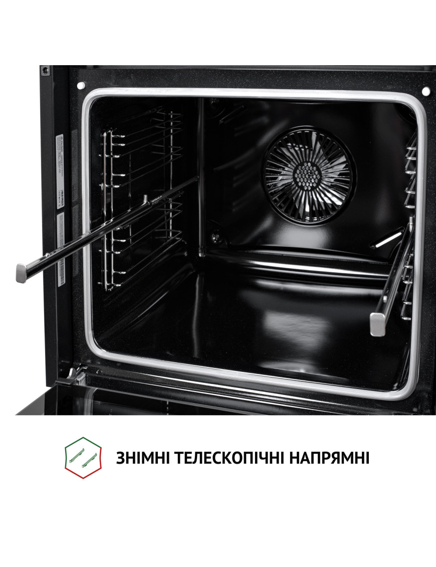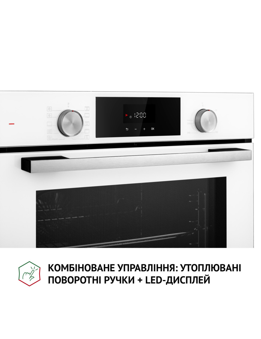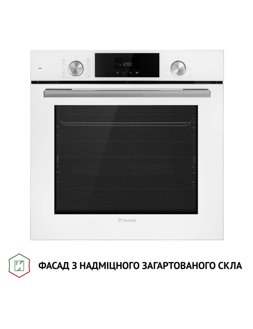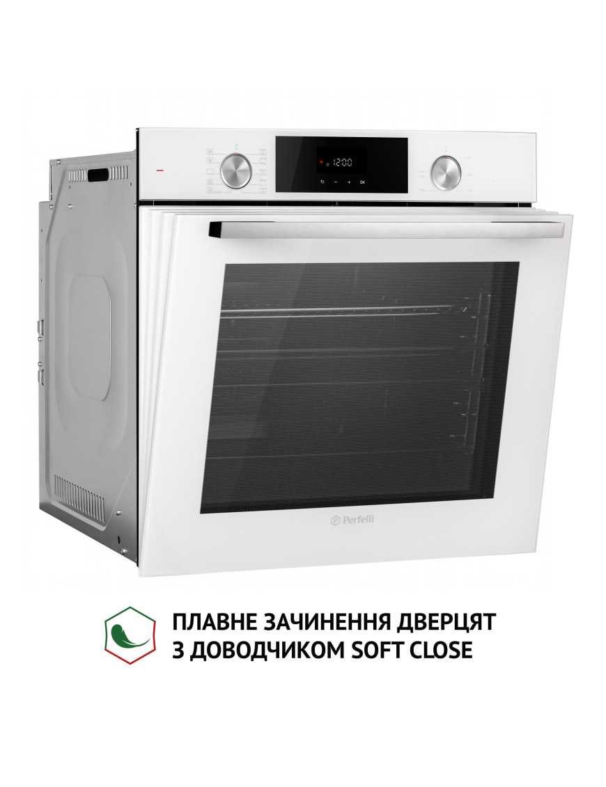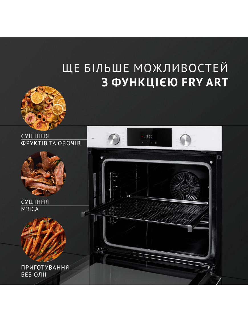 Вбудована електрична духова шафа • Ширина(мм): 600 • Колір: Білий • Керування: Утоплюючі ручки управління + LED white дисплей• К-сть програм: 10 • Об'єм(л): 73 • Матеріал панелі керув.: Скло • Матеріал дверцят духовки: Скло SCHOTT • Тип направляючих: Хромовані знімні+ 1-рівень телескопічних напрямних • К-сть рівнів направляючих: 6 • Внутрішнє покриття: Антипригарна емаль легкого очищення Semplice • Режими приготування: Підсвічування внутрішньої камери; Розморожування; Нижній нагрів; Нижній нагрів+ Кільцевий нагрів + Вентилятор; Кільцевий нагрів + Вентилятор (FryArt); Малий гриль+ вентилятор; Гриль; Гриль + вентилятор; Статичний нагрів (верхній і нижній нагрів); Статичний нагрів + Вентилятор • Функції: Підсвічування внутрішньої камери, Знімне скло, Знімні направляючі, Функція нагадування (Будильник), Таймер з відключенням духовки та відкладеним стартом, Тангенціальне охолодження • Особливості: Потрійне гартоване скло дверцяти Low-e; Система плавного закривання дверцят Soft Close • Тип/ Потужність гриля(Вт):