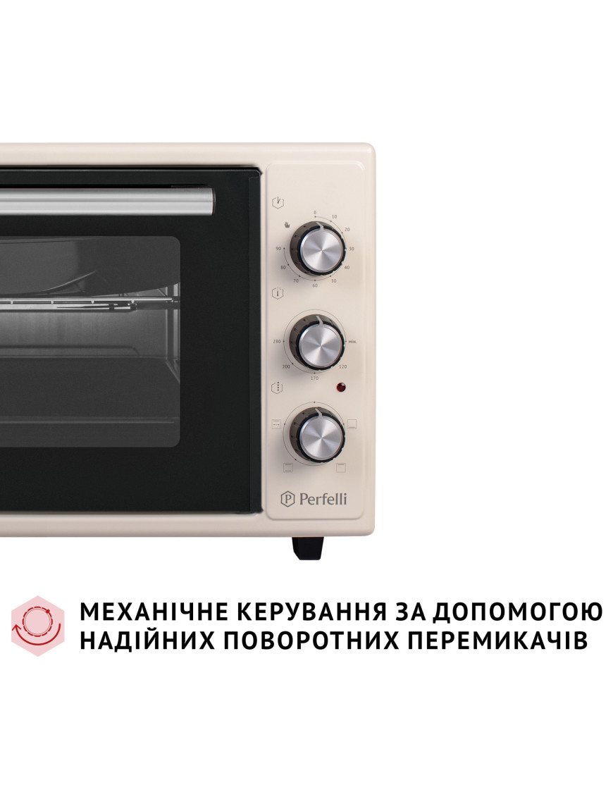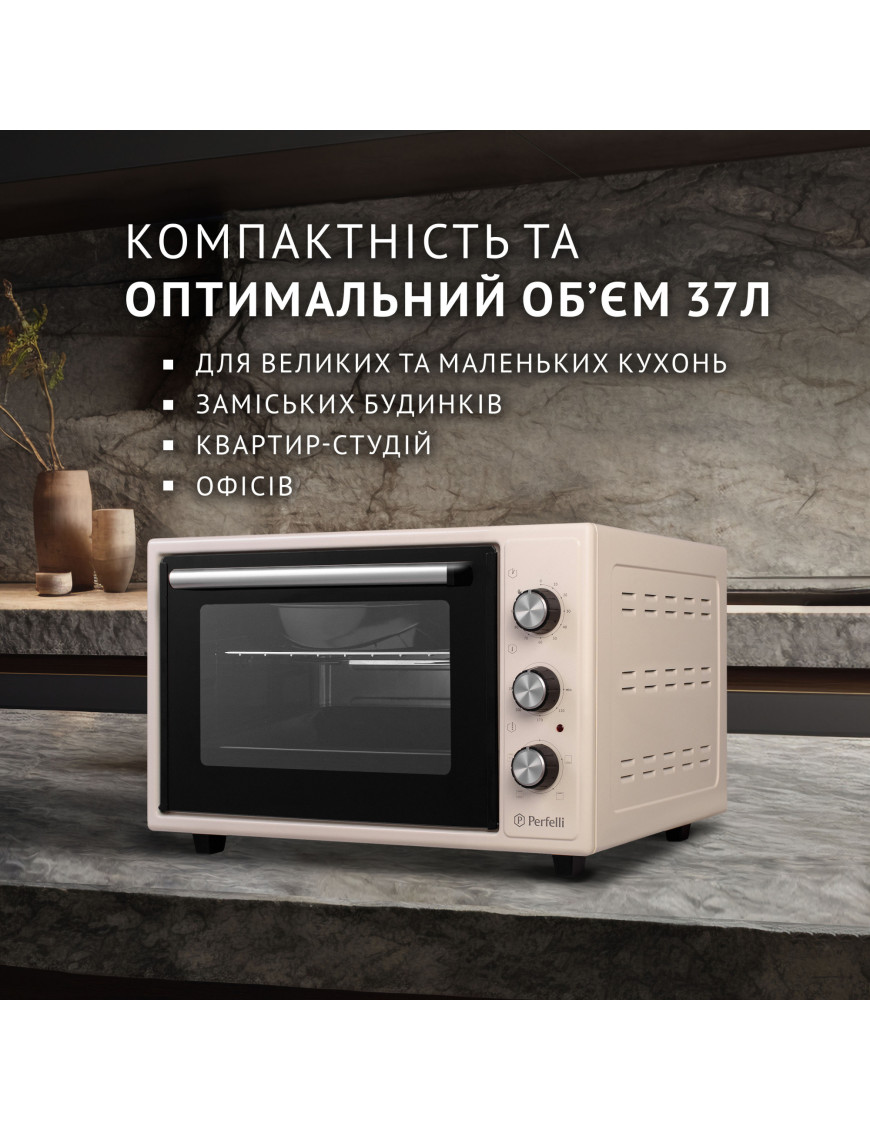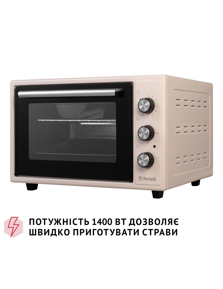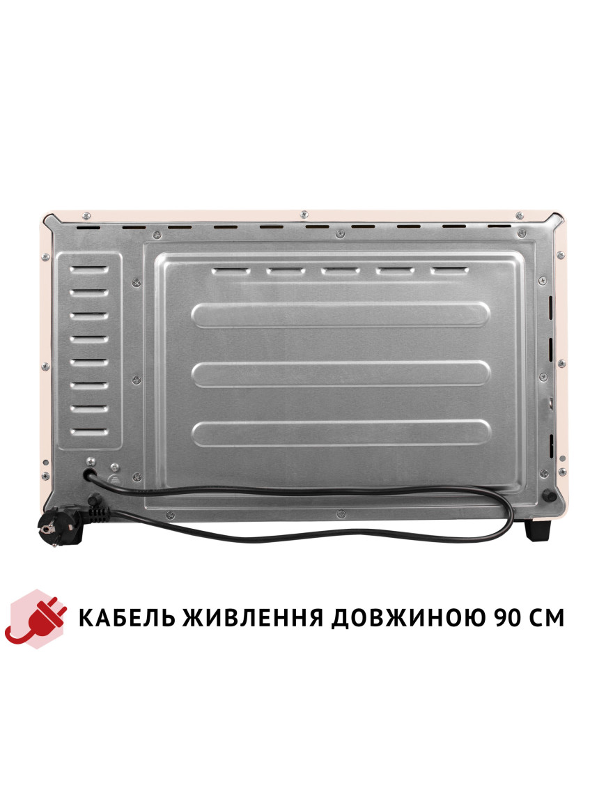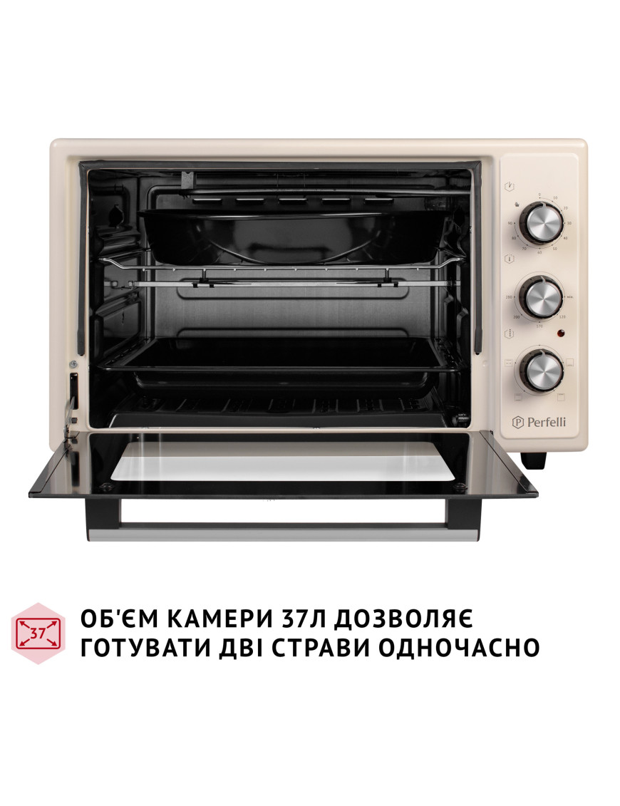 Електрична міні піч • Колір: Бежевий • Матеріал корпусу: Емальована сталь • Потужність(Вт): 1400 • Об'єм(л): 37 • Лампа підсвічування: Так • Керування: Механічне • Діапазон температури(°С): 100-280 • К-сть програм: 4 • Функції приготування: Верхній нагрів; Нижній нагрів; Верхній + нижній нагрів; Верхній нагрів + Рожен • Таймер: Механічний (90хв.) • Особливості: Покриття бічних стінок термостійкою емаллю Semplice, Прихований нижній нагрівальний елемент • Комплектація: Універсальне деко. Кругле деко. Решітка. Рожен. Книга рецептів. Інструкція з експлуатації. Гарантійний талон • Кабель живлення з вилкою: Так • Підключення до електромережі: 220-240 В • Розміри приладу (см)(ШхВхГ): 50,5x32,5x41,6 • Розмір упаковки(см)(ШхВхГ): 54,5x37x44,5