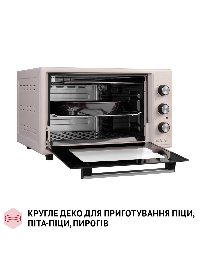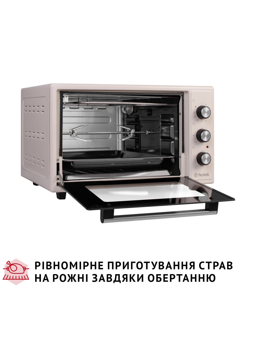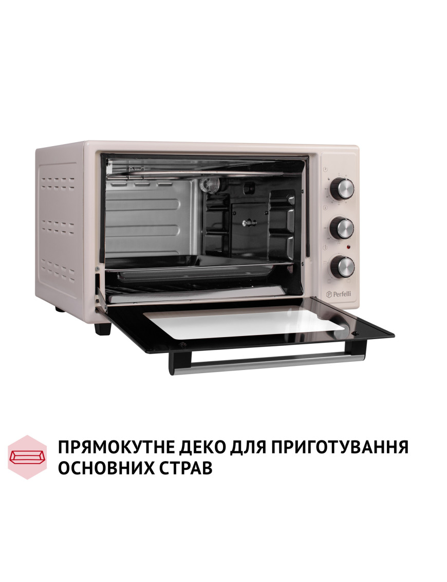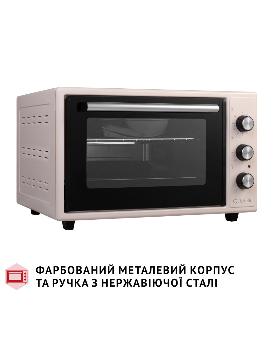 Електрична міні піч • Колір: Бежевий • Матеріал корпусу: Емальована сталь • Потужність(Вт): 1400 • Об'єм(л): 37 • Лампа підсвічування: Так • Керування: Механічне • Діапазон температури(°С): 100-280 • К-сть програм: 4 • Функції приготування: Верхній нагрів; Нижній нагрів; Верхній + нижній нагрів; Верхній нагрів + Рожен • Таймер: Механічний (90хв.) • Особливості: Покриття бічних стінок термостійкою емаллю Semplice, Прихований нижній нагрівальний елемент • Комплектація: Універсальне деко. Кругле деко. Решітка. Рожен. Книга рецептів. Інструкція з експлуатації. Гарантійний талон • Кабель живлення з вилкою: Так • Підключення до електромережі: 220-240 В • Розміри приладу (см)(ШхВхГ): 50,5x32,5x41,6 • Розмір упаковки(см)(ШхВхГ): 54,5x37x44,5