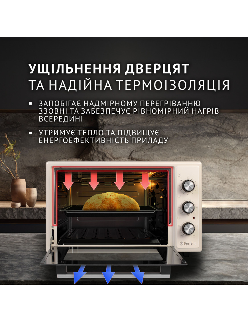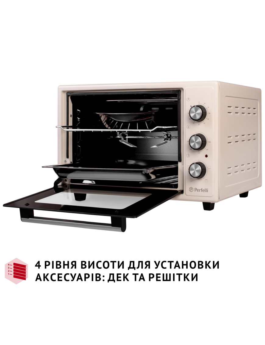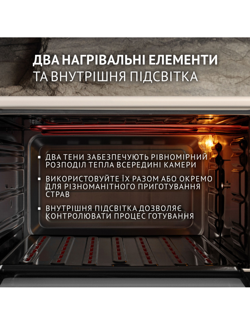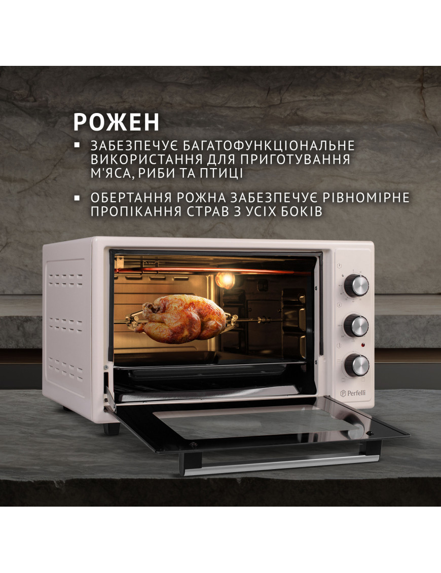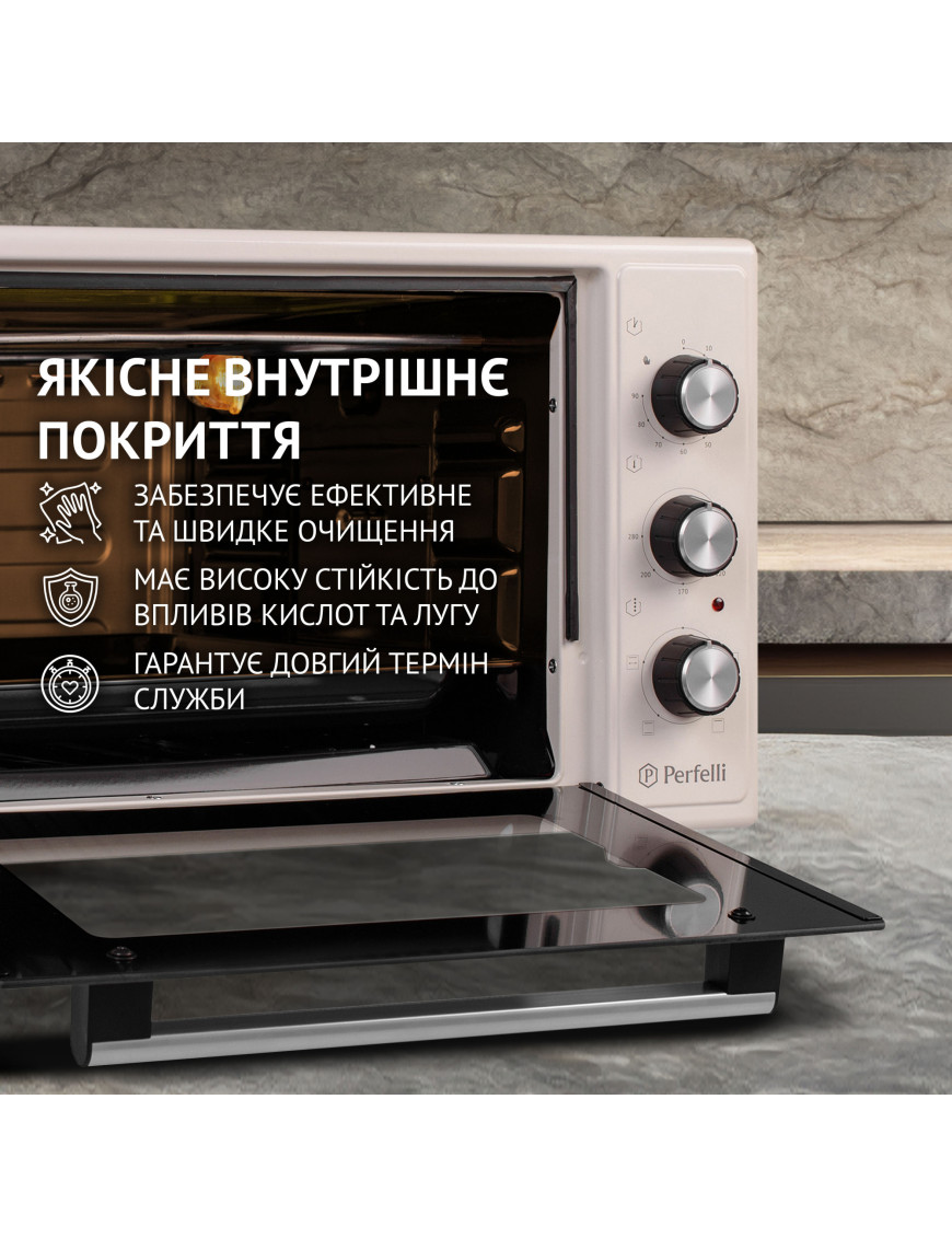 Електрична міні піч • Колір: Бежевий • Матеріал корпусу: Емальована сталь • Потужність(Вт): 1400 • Об'єм(л): 37 • Лампа підсвічування: Так • Керування: Механічне • Діапазон температури(°С): 100-280 • К-сть програм: 4 • Функції приготування: Верхній нагрів; Нижній нагрів; Верхній + нижній нагрів; Верхній нагрів + Рожен • Таймер: Механічний (90хв.) • Особливості: Покриття бічних стінок термостійкою емаллю Semplice, Прихований нижній нагрівальний елемент • Комплектація: Універсальне деко. Кругле деко. Решітка. Рожен. Книга рецептів. Інструкція з експлуатації. Гарантійний талон • Кабель живлення з вилкою: Так • Підключення до електромережі: 220-240 В • Розміри приладу (см)(ШхВхГ): 50,5x32,5x41,6 • Розмір упаковки(см)(ШхВхГ): 54,5x37x44,5