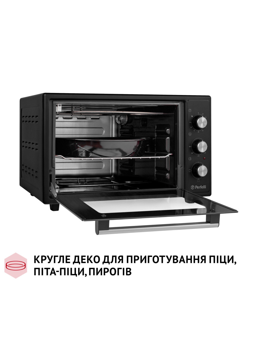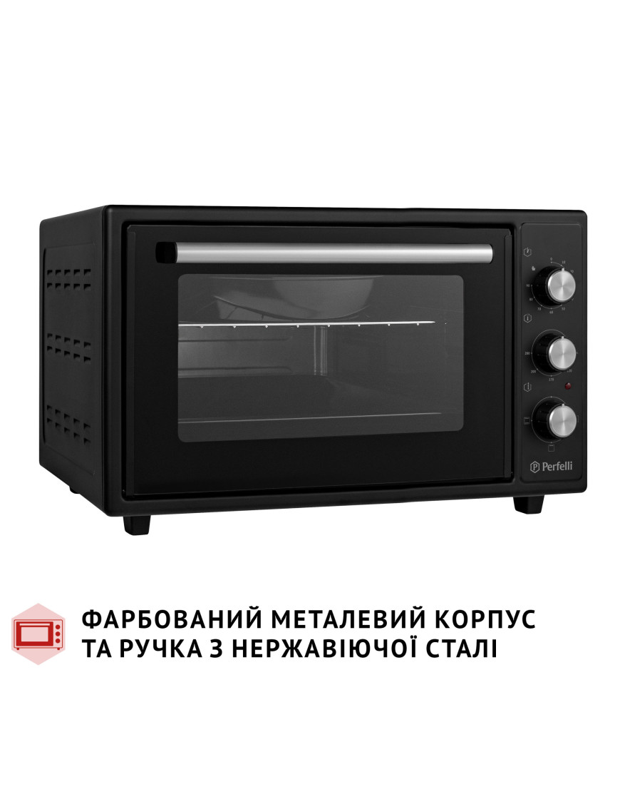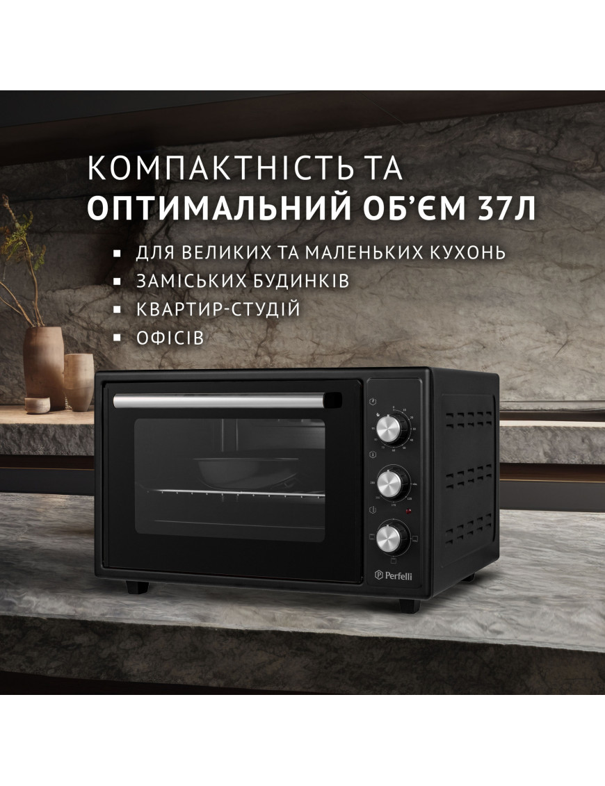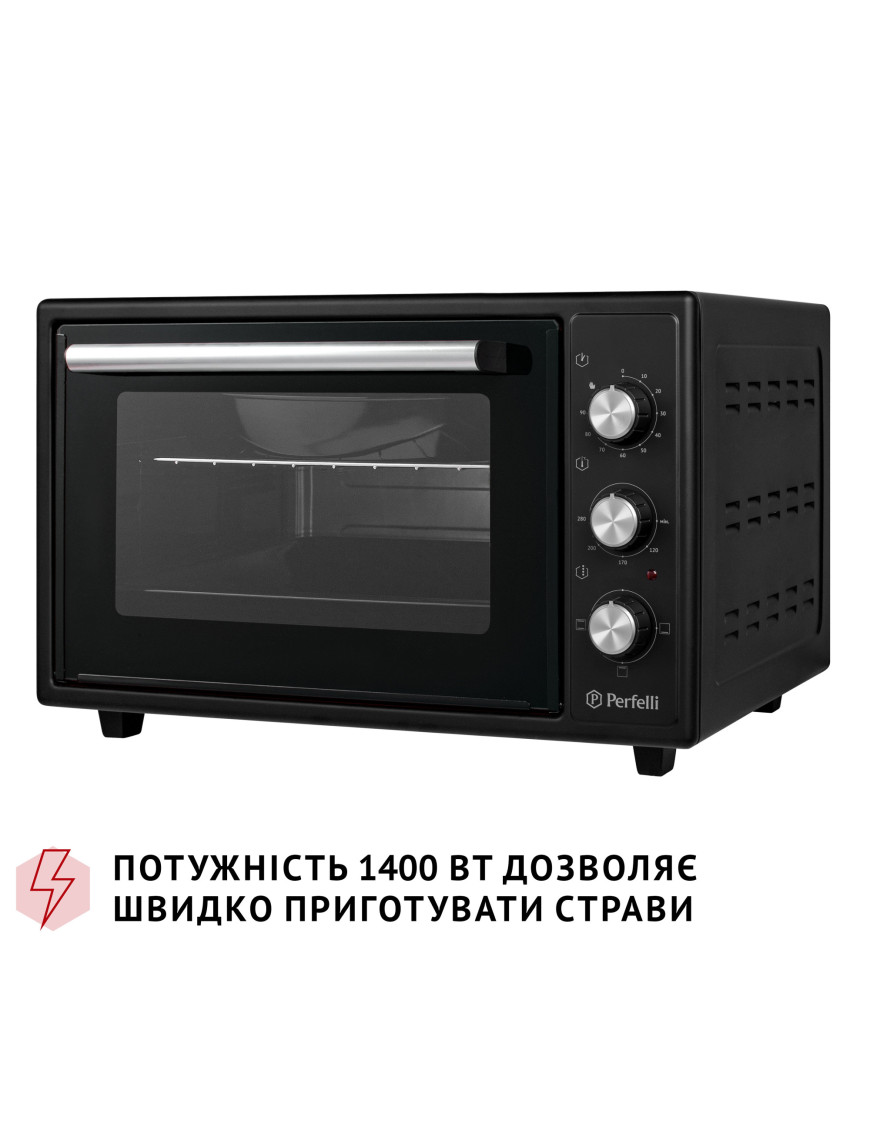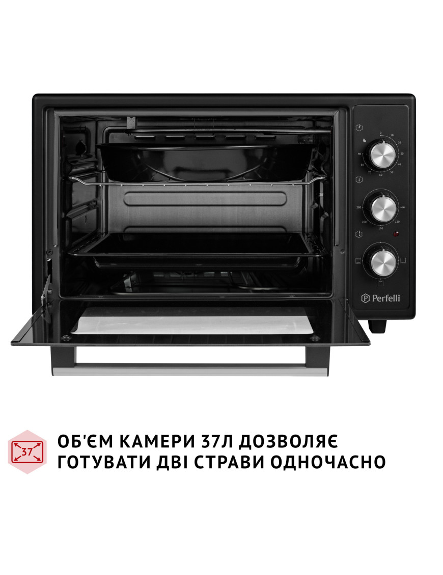 Електрична міні піч • Колір: Чорний • Матеріал корпусу: Емальована сталь • Потужність(Вт): 1400 • Об'єм(л): 37 • Лампа підсвічування: Так • Керування: Механічне • Діапазон температури(°С): 100-280 • К-сть програм: 3 • Функції приготування: Верхній нагрів; Нижній нагрів; Верхній + нижній нагрів • Таймер: Механічний (90хв.) • Особливості: Покриття бічних стінок термостійкою емаллю Semplice • Комплектація: Універсальне деко. Кругле деко. Решітка. Книга рецептів. Інструкція з експлуатації. Гарантійний талон • Кабель живлення з вилкою: Так • Підключення до електромережі: 220-240 В • Розміри приладу (см)(ШхВхГ): 50,5x32,5x41,6 • Розмір упаковки(см)(ШхВхГ): 54,5x37x44,5