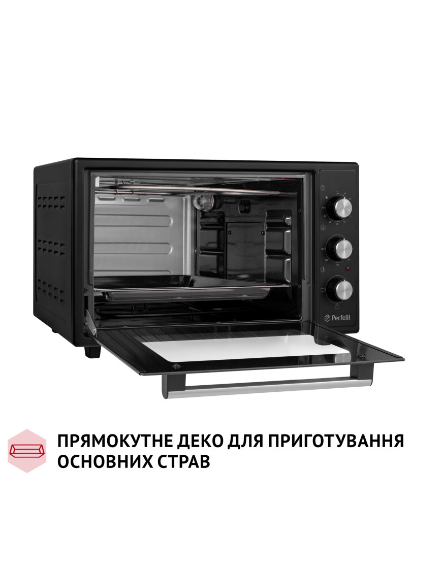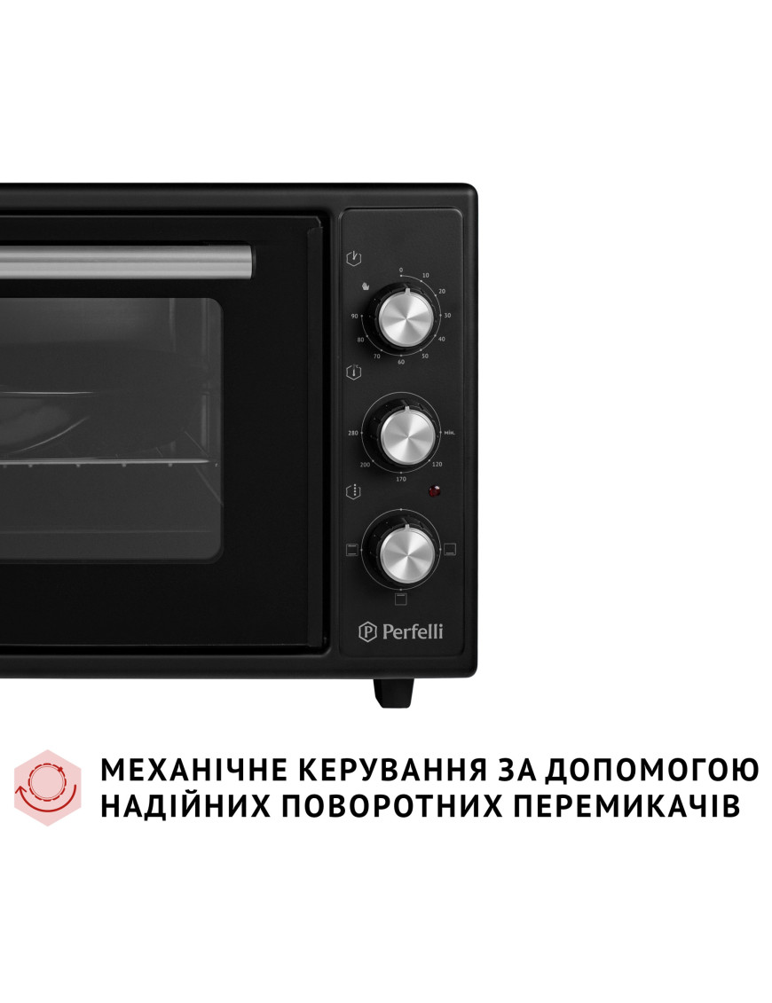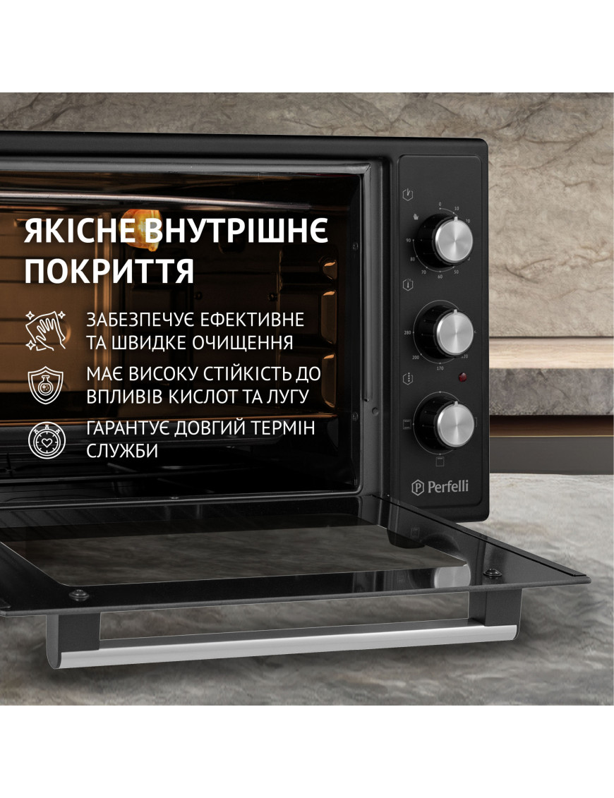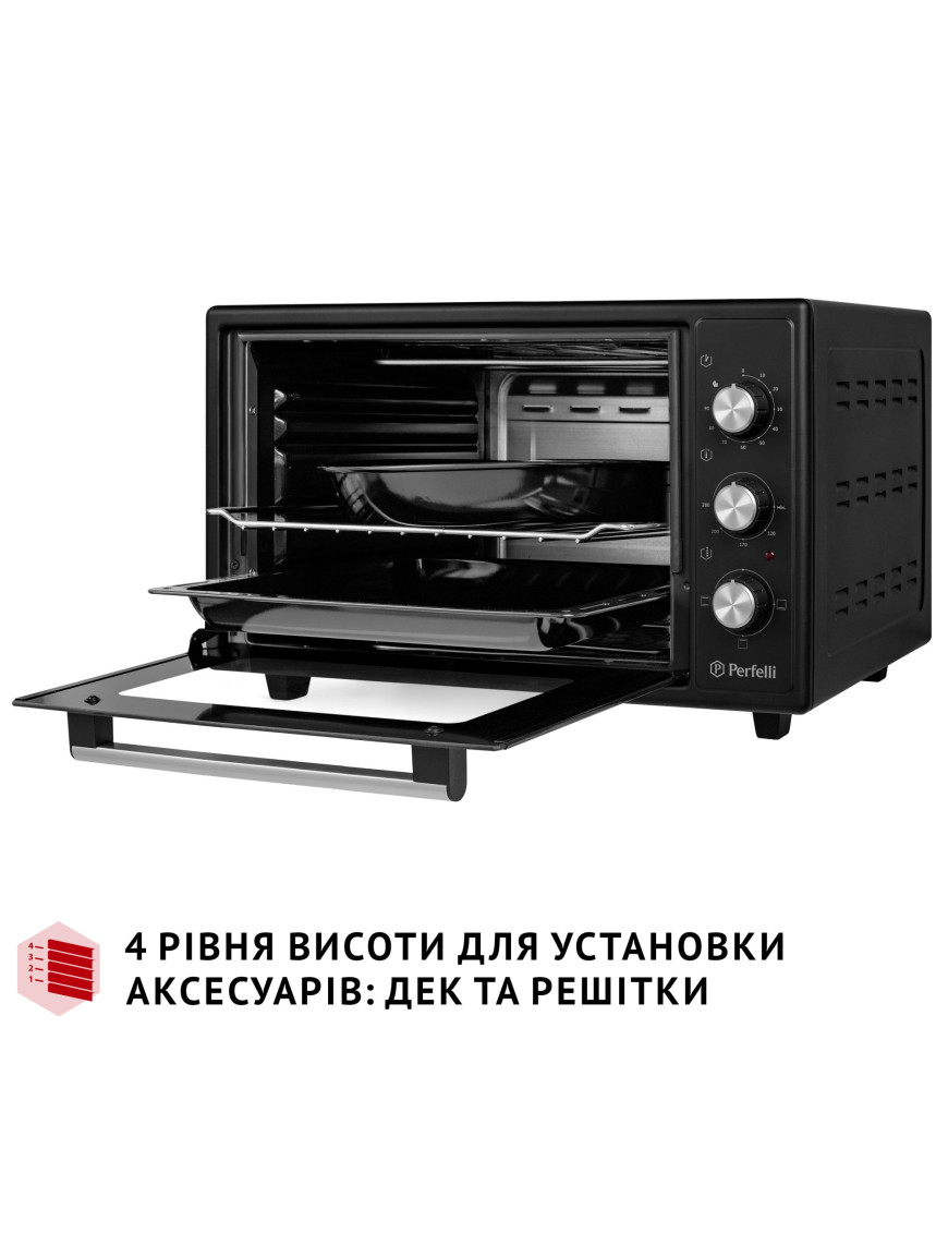 Електрична міні піч • Колір: Чорний • Матеріал корпусу: Емальована сталь • Потужність(Вт): 1400 • Об'єм(л): 37 • Лампа підсвічування: Так • Керування: Механічне • Діапазон температури(°С): 100-280 • К-сть програм: 3 • Функції приготування: Верхній нагрів; Нижній нагрів; Верхній + нижній нагрів • Таймер: Механічний (90хв.) • Особливості: Покриття бічних стінок термостійкою емаллю Semplice • Комплектація: Універсальне деко. Кругле деко. Решітка. Книга рецептів. Інструкція з експлуатації. Гарантійний талон • Кабель живлення з вилкою: Так • Підключення до електромережі: 220-240 В • Розміри приладу (см)(ШхВхГ): 50,5x32,5x41,6 • Розмір упаковки(см)(ШхВхГ): 54,5x37x44,5