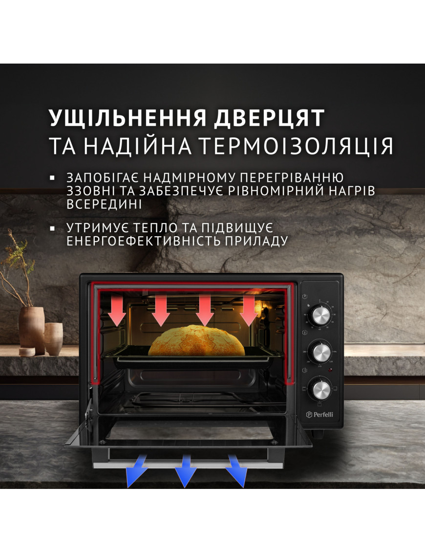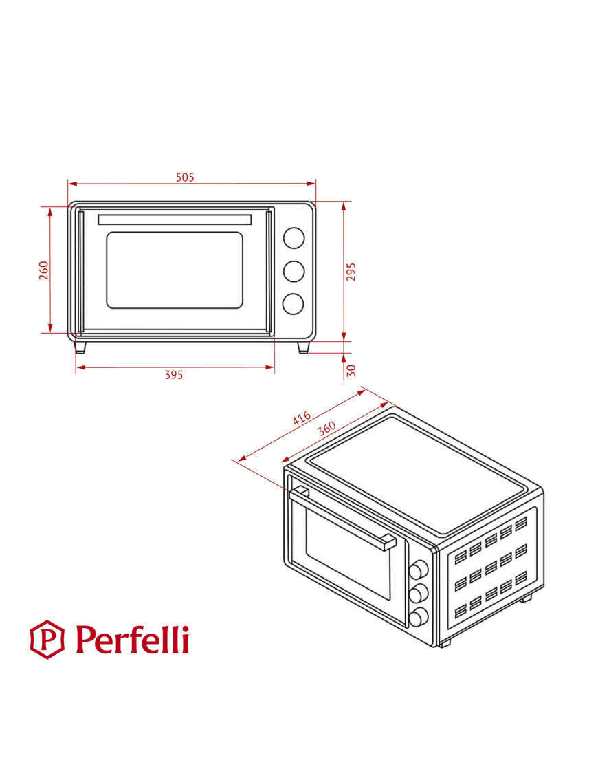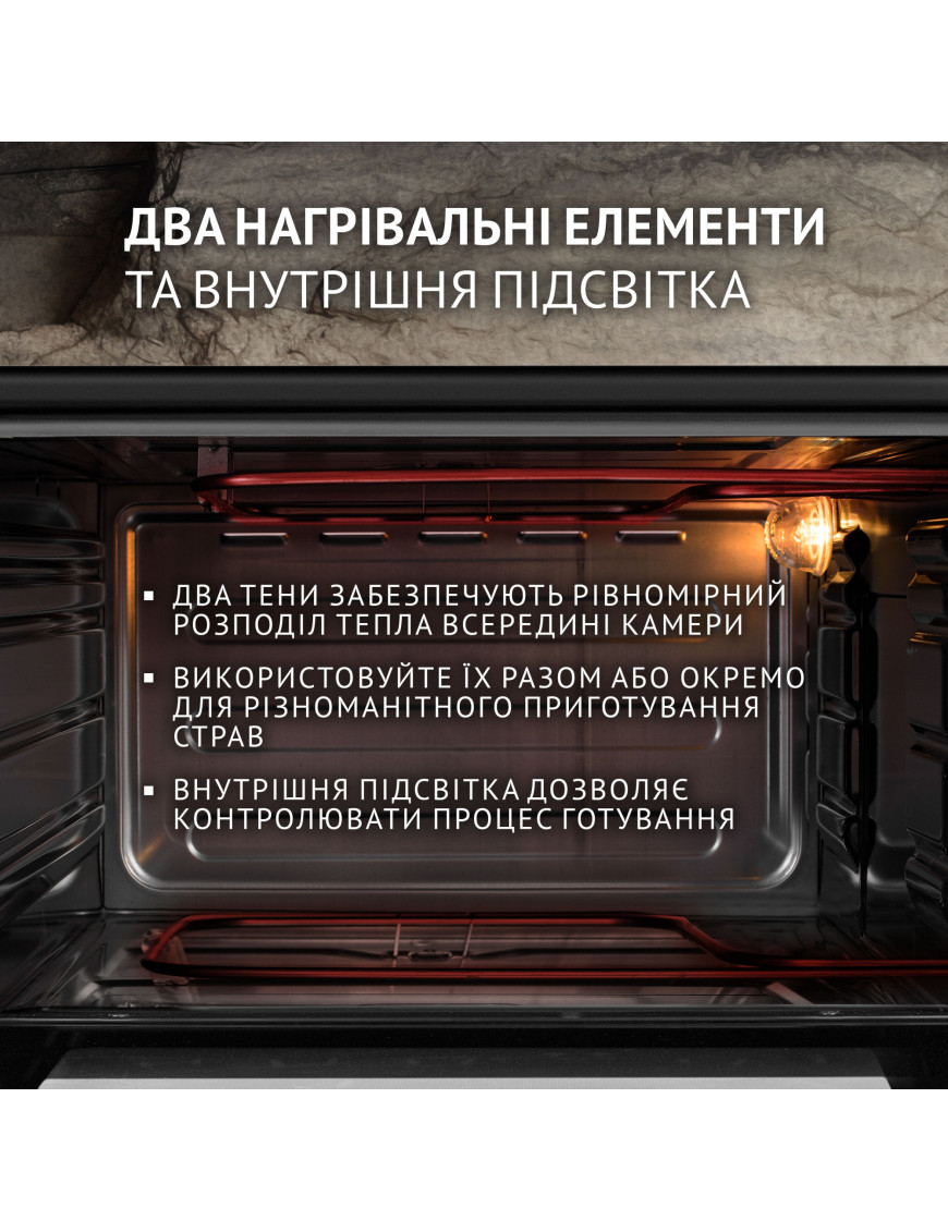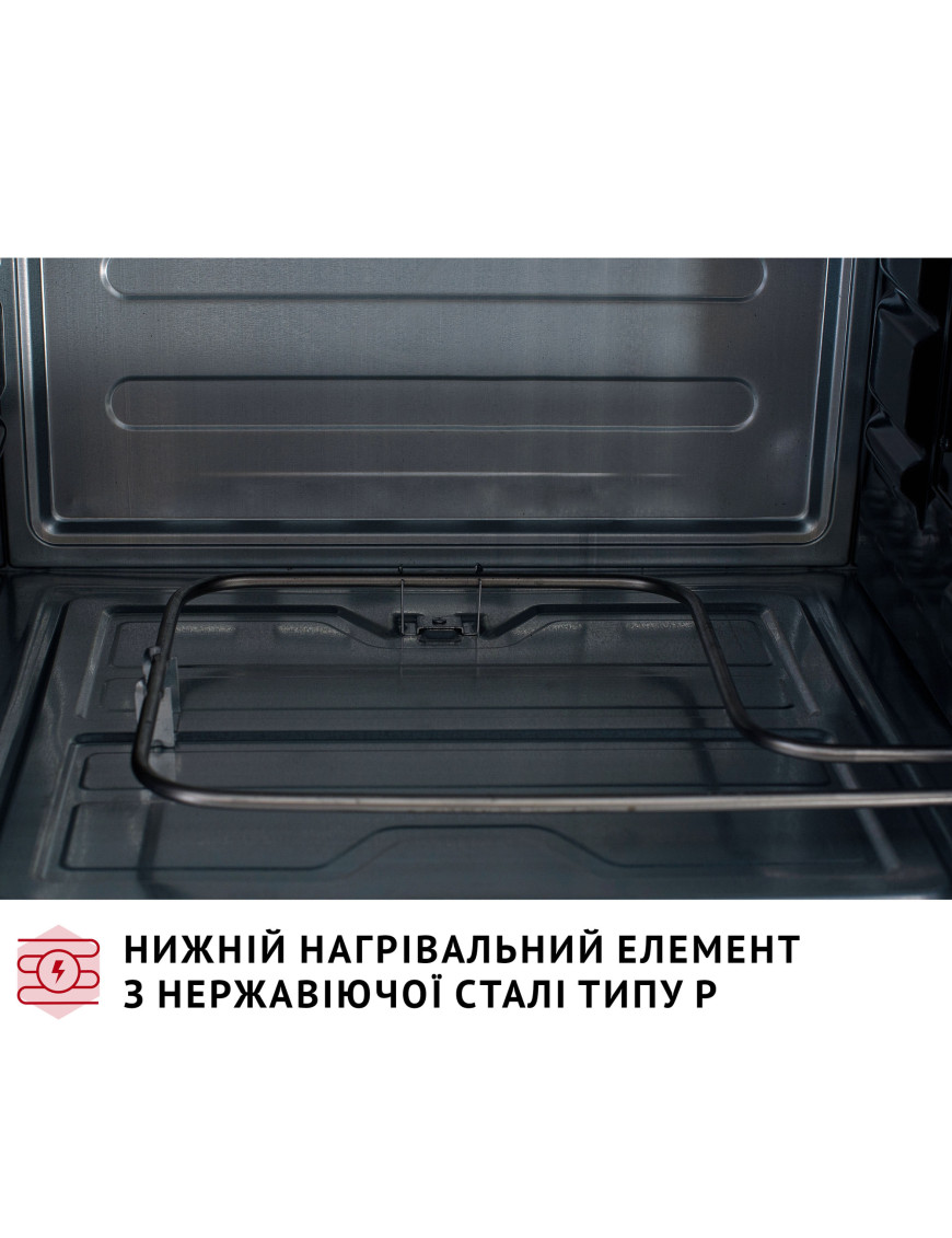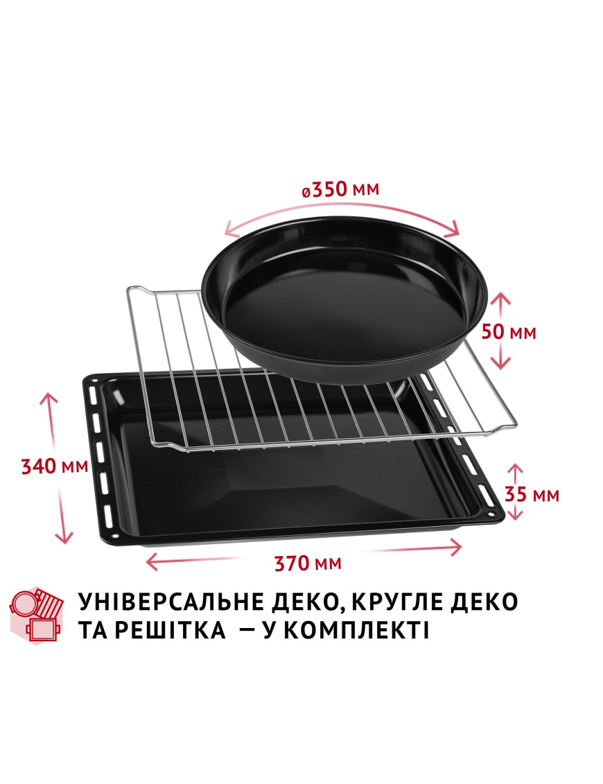 Електрична міні піч • Колір: Чорний • Матеріал корпусу: Емальована сталь • Потужність(Вт): 1400 • Об'єм(л): 37 • Лампа підсвічування: Так • Керування: Механічне • Діапазон температури(°С): 100-280 • К-сть програм: 3 • Функції приготування: Верхній нагрів; Нижній нагрів; Верхній + нижній нагрів • Таймер: Механічний (90хв.) • Особливості: Покриття бічних стінок термостійкою емаллю Semplice • Комплектація: Універсальне деко. Кругле деко. Решітка. Книга рецептів. Інструкція з експлуатації. Гарантійний талон • Кабель живлення з вилкою: Так • Підключення до електромережі: 220-240 В • Розміри приладу (см)(ШхВхГ): 50,5x32,5x41,6 • Розмір упаковки(см)(ШхВхГ): 54,5x37x44,5