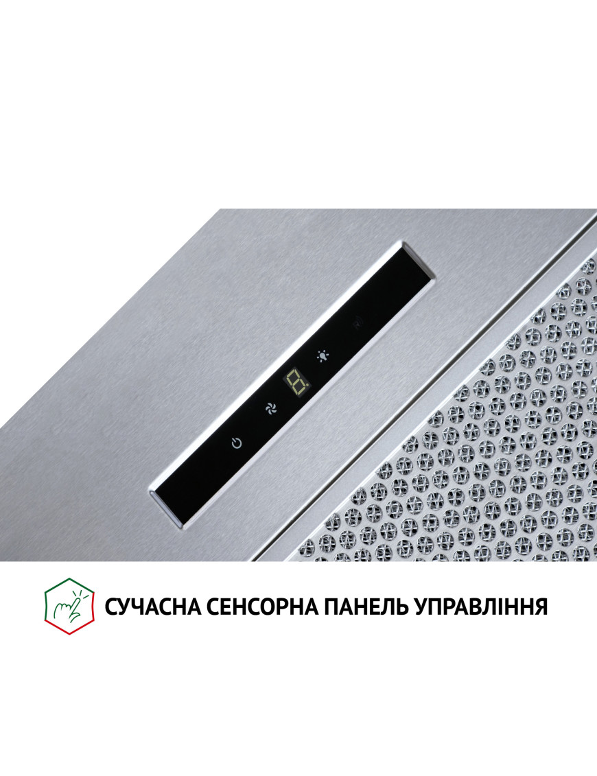 Полновстраиваемая вытяжка, мощность мотора 210 W, производительность 1000 м3/ч., ширина - 520 мм. Цвет вытяжки - нержавеющая сталь. Материал вытяжки - короб - окрашенный металл, фронтальная панель - нержавеющая сталь. Управление сенсорное. 3 скорости. 1 мотор. Освещение 2х1,5 Вт. LED. (боковое освещение) Алюминиевый фильтр с нержавеющей перфорацией. Отвод/Рециркуляция. Уровень шума 61-68 Дб. Пульт в комплекте