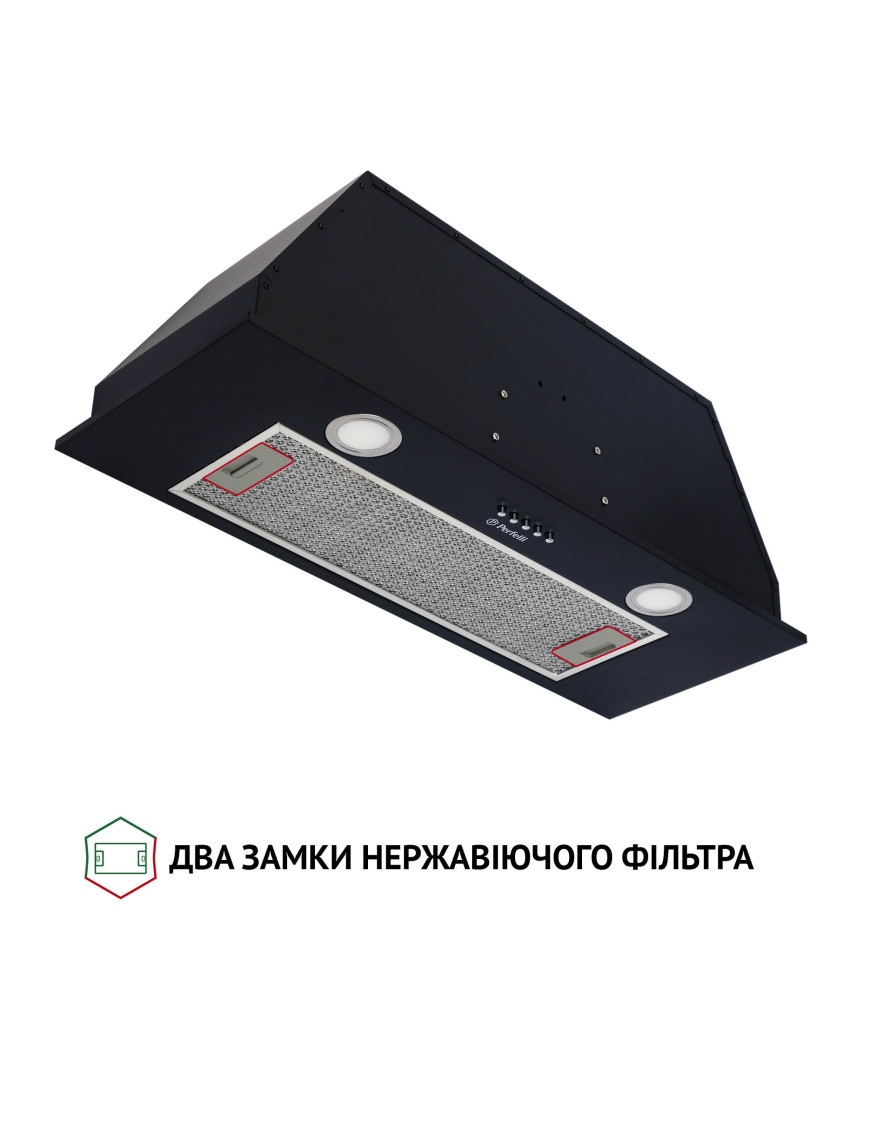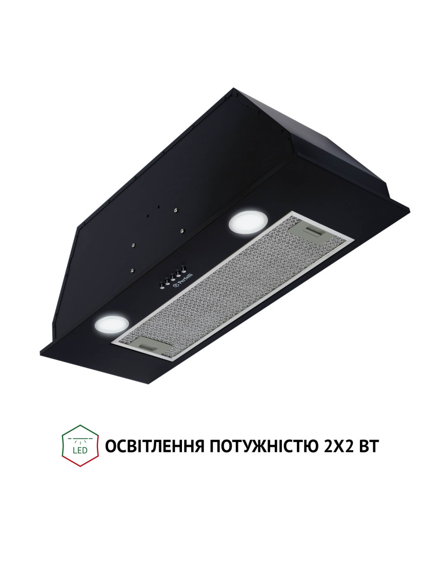 Полновстраиваемая вытяжка, мощность мотора 210 W, производительность 1000 м3/ч., ширина - 720 мм. Цвет вытяжки - черный. Материал вытяжки - окрашенный металл. Управление механическое, кнопочное. 3 скорости. 1 мотор. Освещение 2х2 Вт. LED. Алюминиевый фильтр с нержавеющей перфорацией. Отвод/Рециркуляция. Уровень шума 61-68 Дб.
