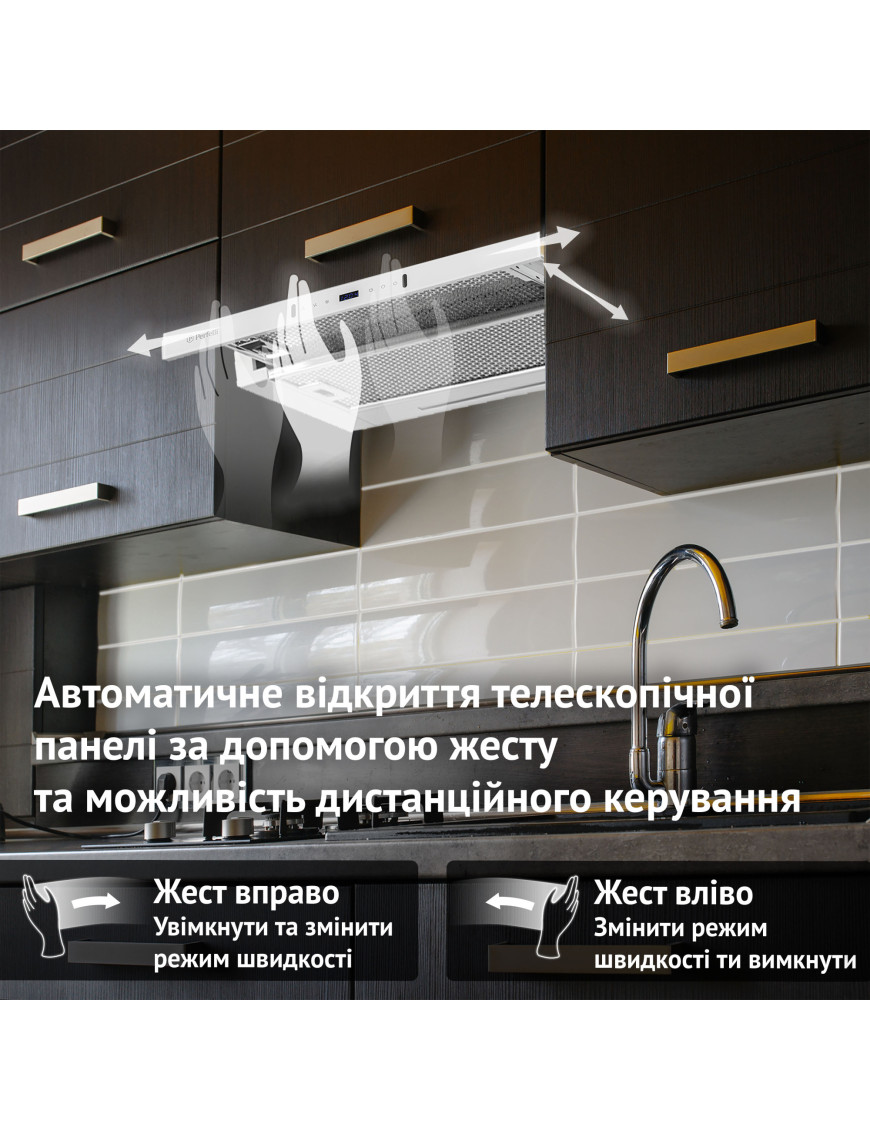 Легкость использования устройства обеспечивает инновационная технология управления жестами - Wave Control. Выдвижная панель автоматически открывается при включении устройства и закрывается при выключении. Данная функция делает вытяжку более удобной и современной. Одним взмахом руки можно переключить скорость и включить/выключить освещение. Это исключает необходимость мыть руки, чтобы коснуться кнопок. Однако для дополнительного удобства вытяжка оборудована и современной сенсорной панелью.