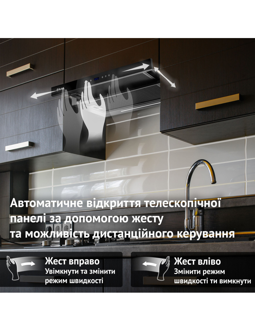 Легкость использования устройства обеспечивает инновационная технология управления жестами - Wave Control. Выдвижная панель автоматически открывается при включении устройства и закрывается при выключении. Данная функция делает вытяжку более удобной и современной. Одним взмахом руки можно переключить скорость и включить/выключить освещение. Это исключает необходимость мыть руки, чтобы коснуться кнопок. Однако для дополнительного удобства вытяжка оборудована и современной сенсорной панелью.