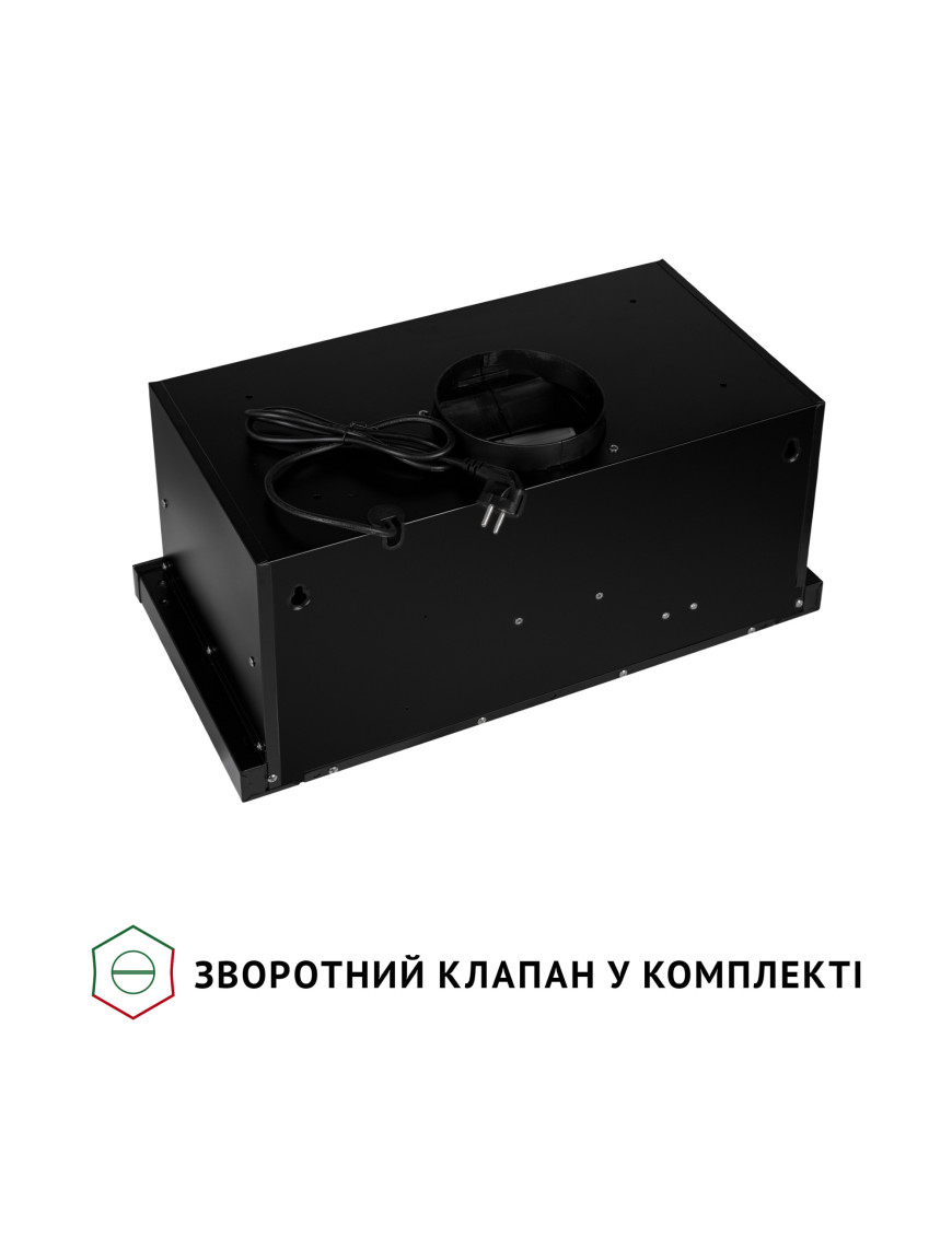 Фильтр, как и корпус вытяжки, выполнен в черном цвете. Это делает ее вид сдержанным и минималистским. Благодаря этому устройство отлично впишется в интерьер в темных оттенках, не создавая лишних контрастов.