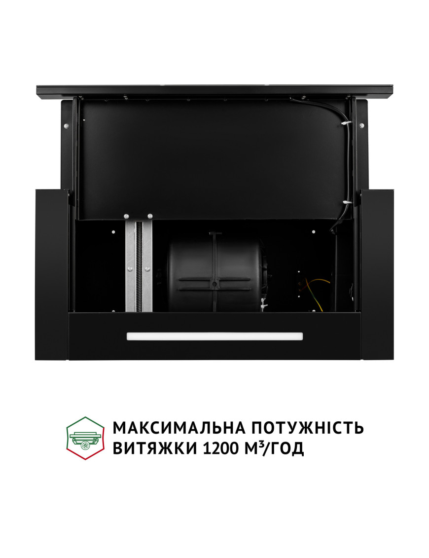 Открытая выдвижная панель увеличивает площадь вытяжной поверхности. Это позволяет вытяжке поглощать больше воздуха, занимая минимум кухонного пространства.