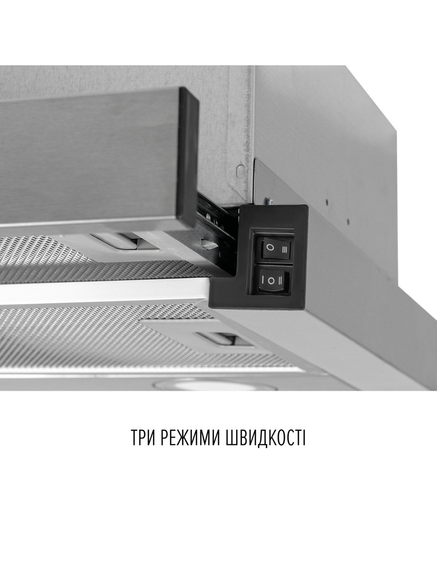 Управлять вытяжкой удобно и легко! Механическая панель управления состоит из переключателей скоростей и включения/выключения освещения. Практичное расположение механических переключателей управления по бокам позволит осуществлять быстрые манипуляции с устройством без лишних усилий.