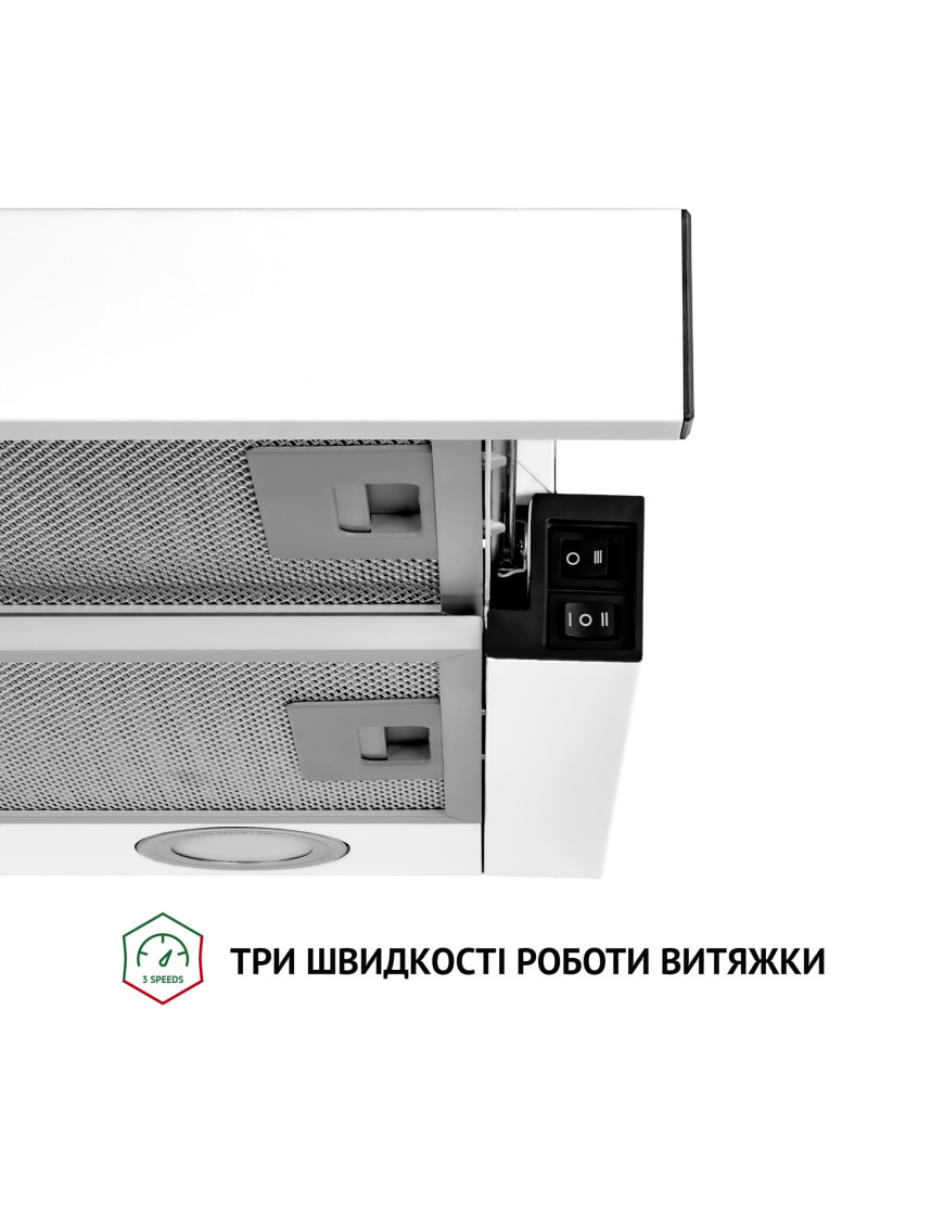 Вытяжка для кухни работает на трех скоростях, что позволяет выбирать нужную интенсивность очистки воздуха в зависимости от его загрязненности.
