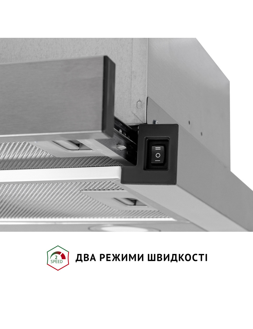 Вытяжка для кухни работает на двух скоростях, что позволяет выбирать нужную интенсивность очистки воздуха в зависимости от его загрязненности.