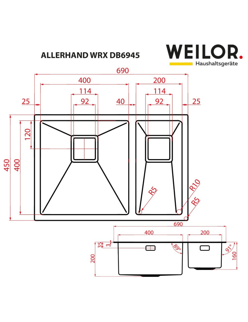 Мойка кухонная нержавеющая сталь WEILOR ALLERHAND WRX DB6945