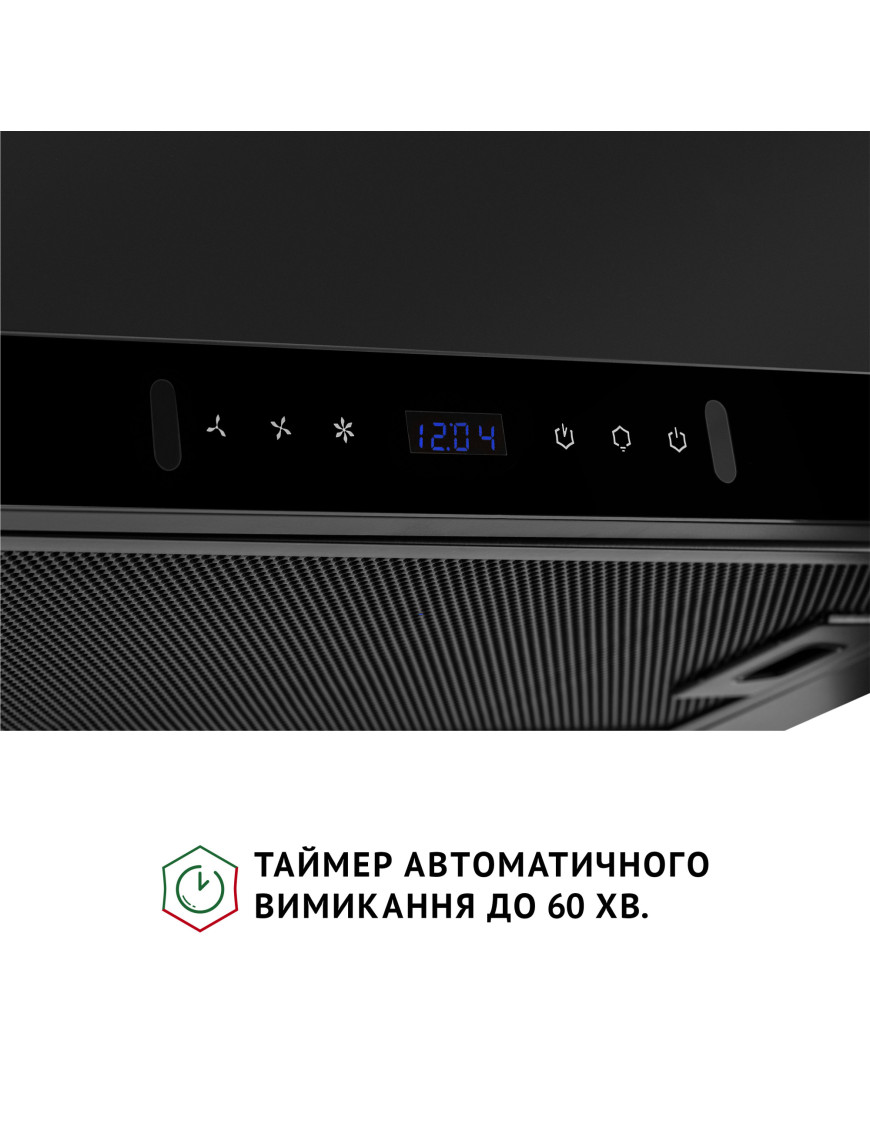 Таймер позволяет эффективно контролировать продолжительность фильтрации воздуха. Он автоматически включается на 3 минуты или настраивается от 10 до 60 минут. По истечении установленного времени работы срабатывает автоматическое выключение вытяжки. Эта функция позволяет экономить электроэнергию, удерживать оптимальный уровень вентиляции в помещении и эффективно использовать свое время.