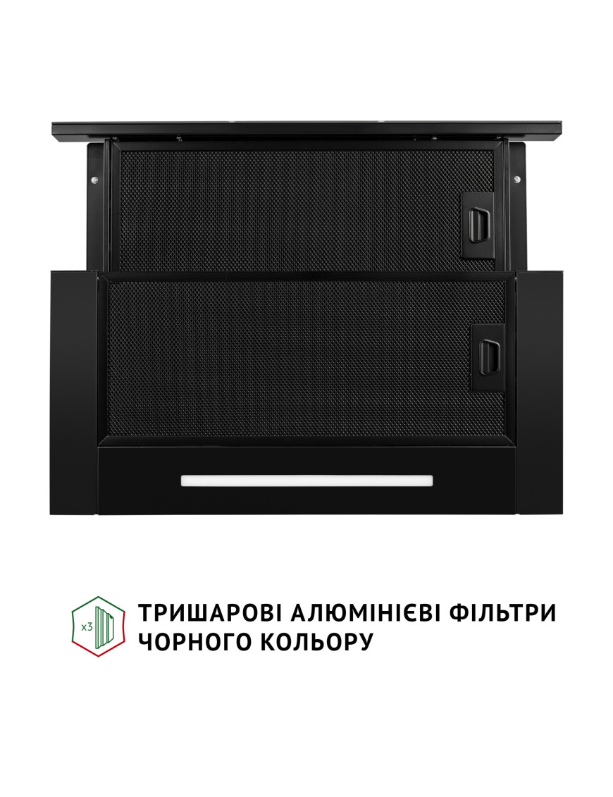 Вытяжка оборудована черными алюминиевыми фильтрами. Они позволяют поддерживать чистоту вентиляционной системы и защищают внутренние детали вытяжки от загрязнений. Кроме того, они легко моются, что делает обслуживание системы удобным и простым.