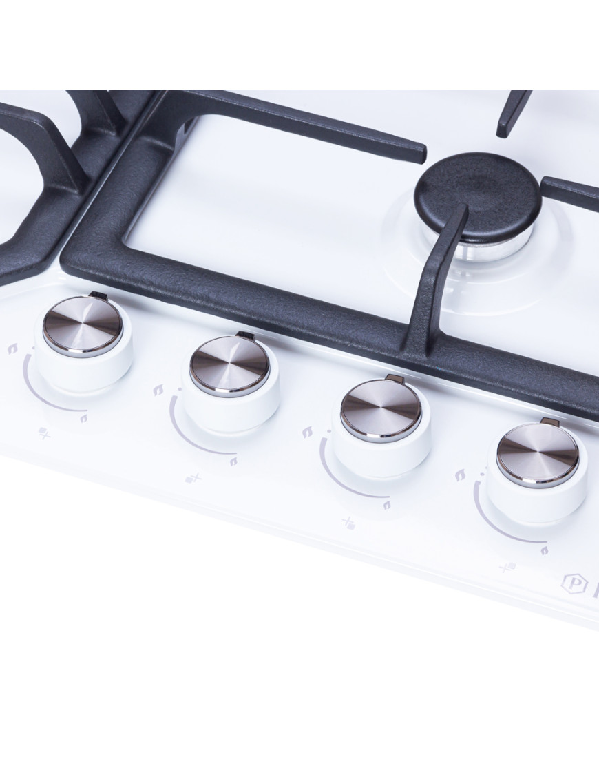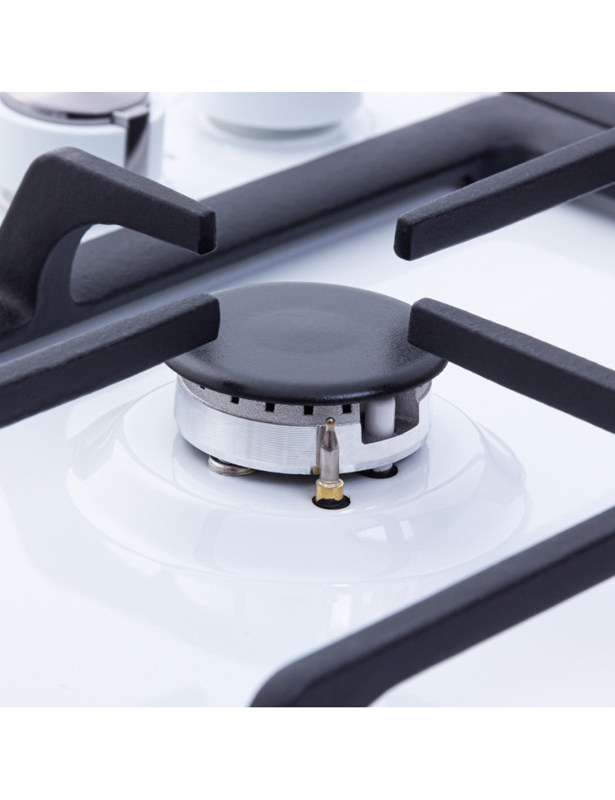 Газовая варочная поверхность, цвет белый, материал - эмалированный металл, ширина 60 см, количество газовых конфорок - 4, электроподжиг в ручках управления, газ-контроль, чугунные решетки, WOK конфорка, фронтальная панель управления, переходник на баллонный газ.