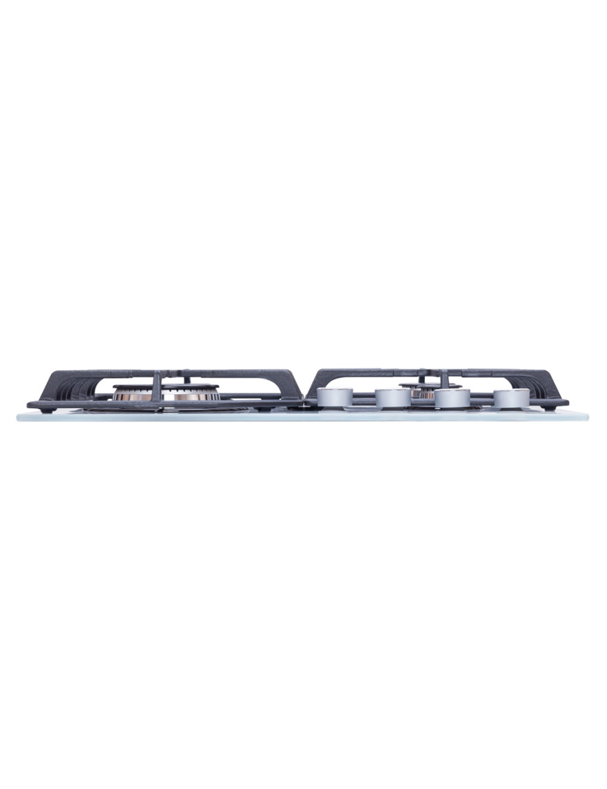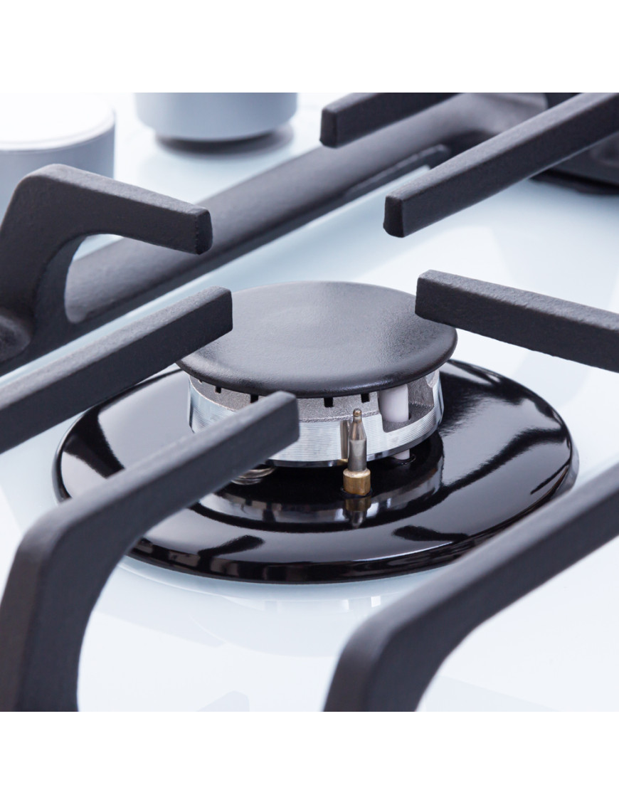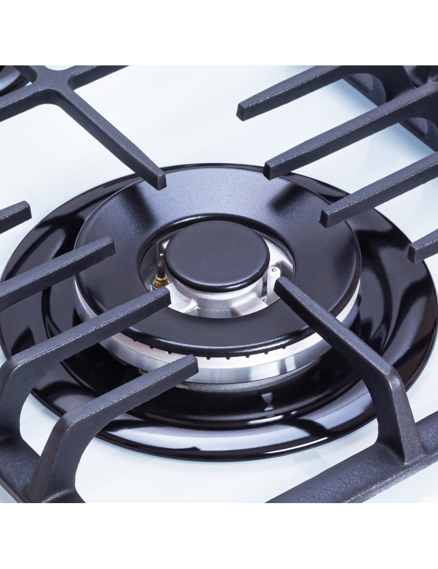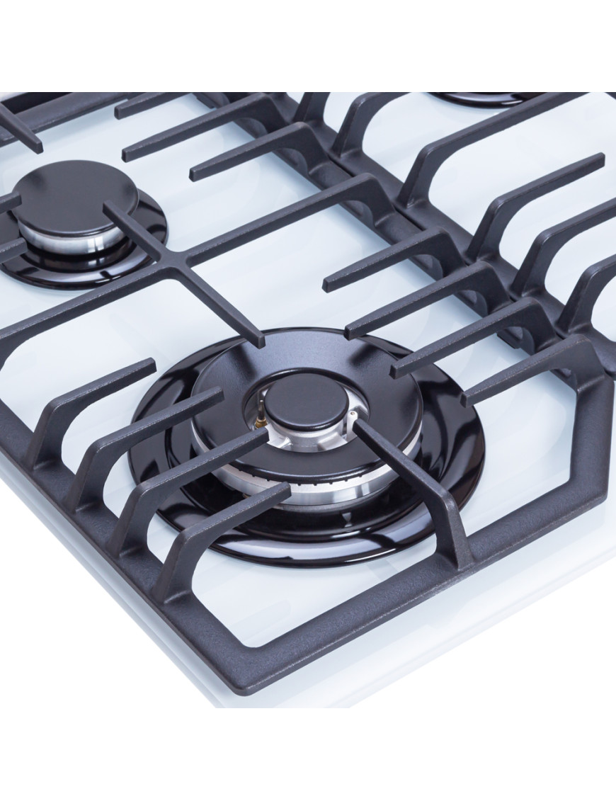 Варильная поверхность "газ на стекле", цвет белое стекло, ширина 60см, 4 газовые конфорки, WOK конфорка, газ - контроль, электроподжиг в ручках управления, чугунные решетки, фронтальная панель управления, переходники (жиклеры) на баллонный газ