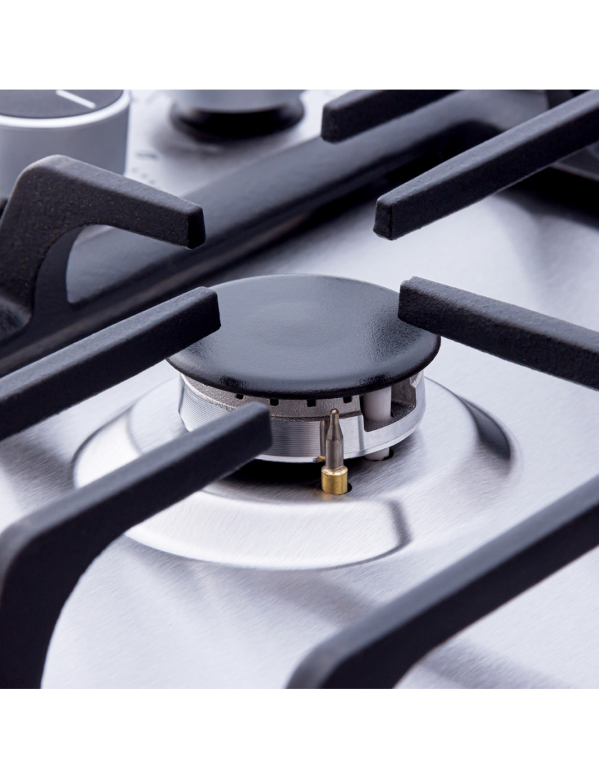 Газовая варочная поверхность Perfelli HGM 61694 - идеальное соотношение качественных комплектующих и функциональности. Материал поверхности изготовлен из нержавеющей стали. Варочная панель оборудована четырьмя газовыми горелками: одной WOK с мощностью - 3.8 кВт, двумя средней мощности и одной вспомогательной. Прибор оснащен функцией электроподжига в ручках управления, системой безопасности "газ-контроль", а также WOK горелкой - для вашего удобства в приготовлении блюда. Эргономичное расположение горелок обеспечивает дополнительный комфорт при использовании нескольких зон одновременно. Также большим плюсом будут долговечные и устойчивые к деформации чугунные решетки в количестве двух штук. Они легко снимаются и очищаются.