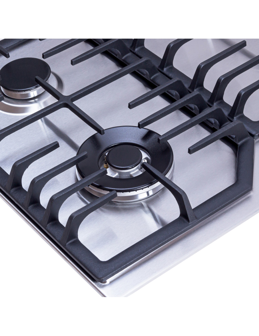 Газовая варочная поверхность, цвет нержавеющая сталь, материал - нержавеющая сталь, ширина 60см, количество газовых конфорок - 4, электроподжиг в ручках управления, газ-контроль, WOK конфорка, чугунные решетки, фронтальная панель управления, переходник на баллонный газ.