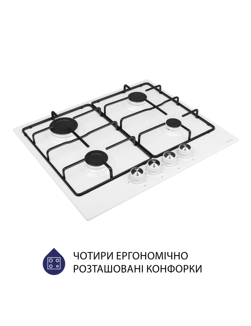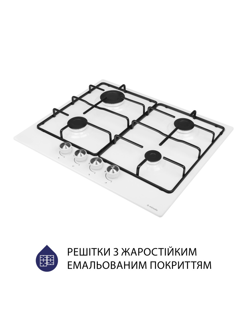 Газовая поверхность Minola MGM 61404 WH обрамлена четкими ровными линиями двух решеток. Поверхность и решетки изготовлены из эмалированного металла высокого качества. Этот материал долговечен и легко очищается от остатков после приготовления пищи. Модель белого цвета легко вписывается в кухонный интерьер, дополняя его и грамотно расставляя акценты.