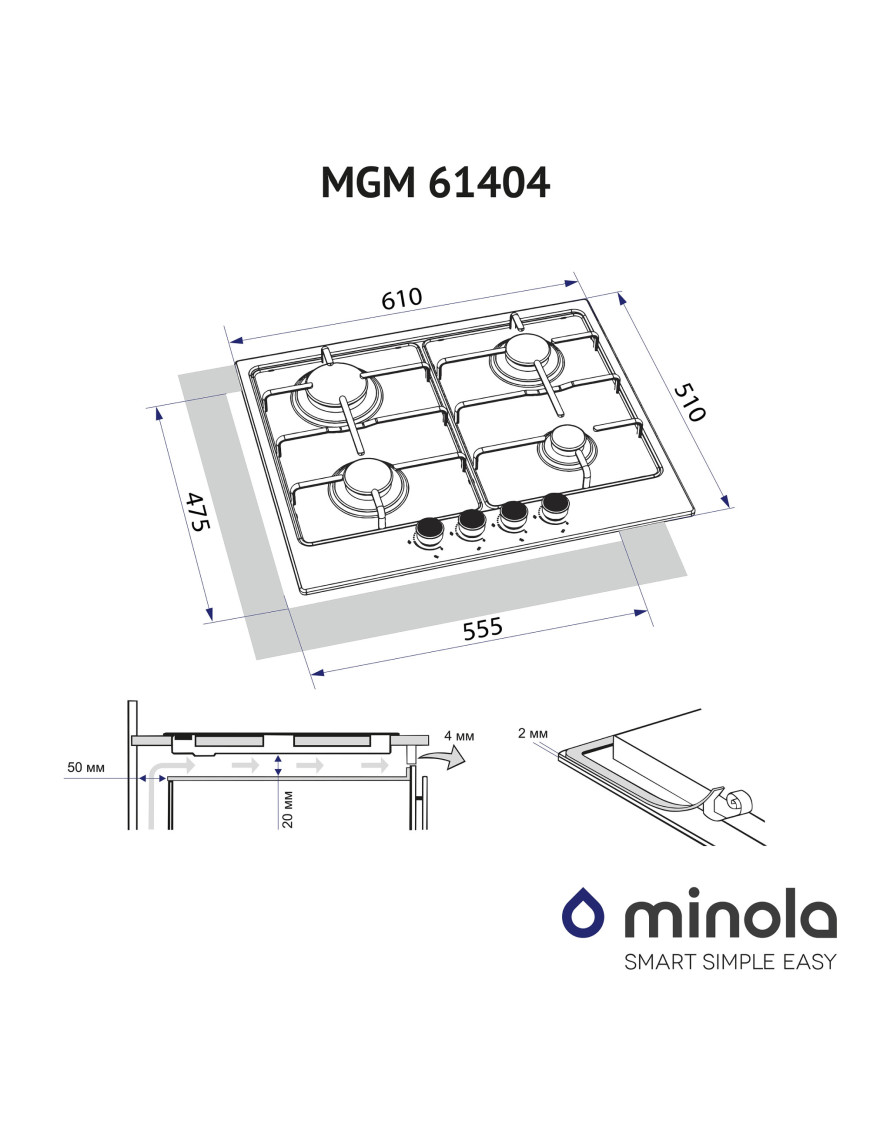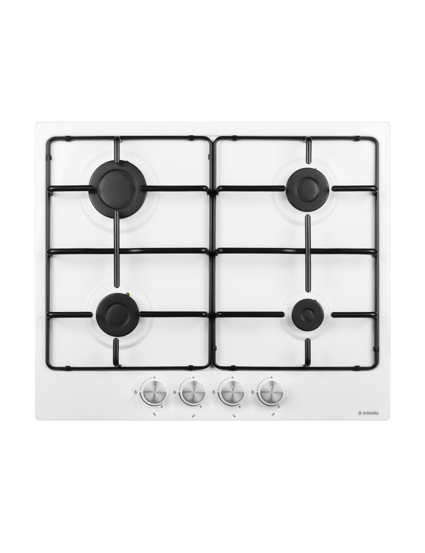 В газовой поверхности на металле Minola MGM 61404 WH гармонично сочетаются элегантность и практичность. Модель оборудована 4-мя конфорками разной мощности, а ее ширина составляет 61 см.