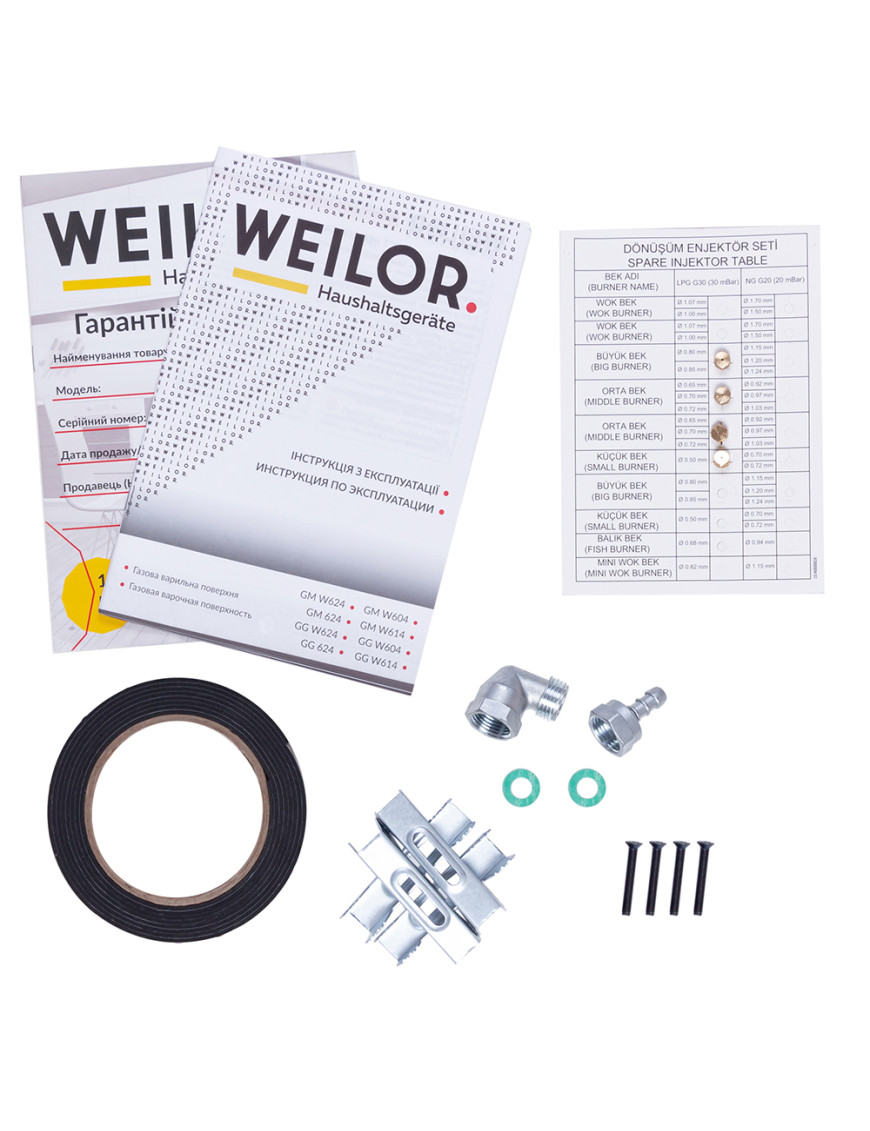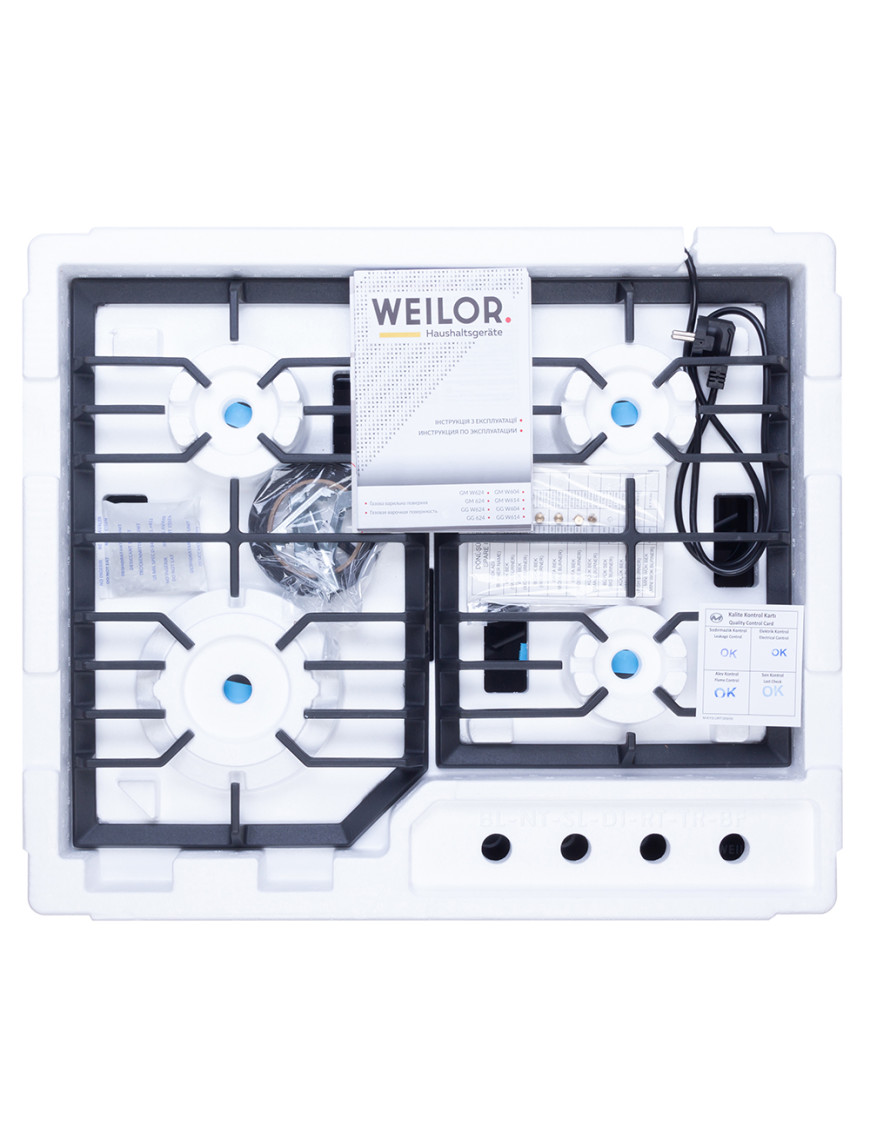 - Варочные поверхности Weilor оснащены системой "газ-контроль", которая автоматически блокирует подачу горючего вещества при отсутствии пламени и обеспечивает максимальную безопасность пользования прибором.