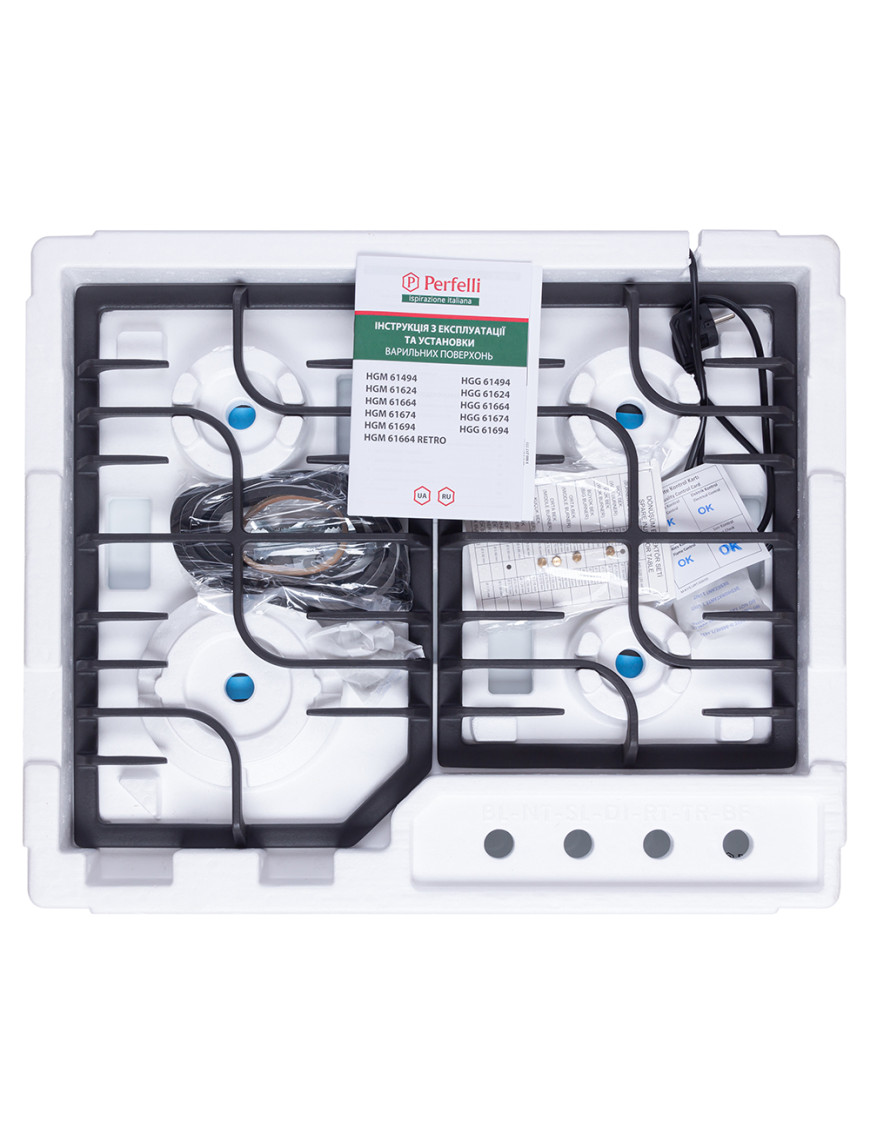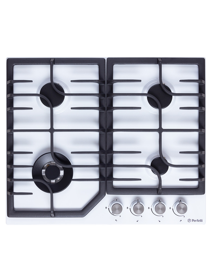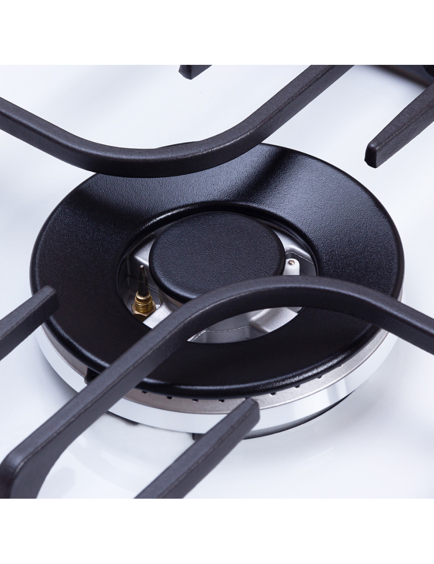 Газовая варочная поверхность, цвет белый, материал - эмалированный металл, ширина 61 см, количество газовых конфорок - 4, электроподжиг в ручках управления, газ-контроль, WOK конфорка, чугунные решетки, фронтальная панель управления, переходник на баллонный газ.