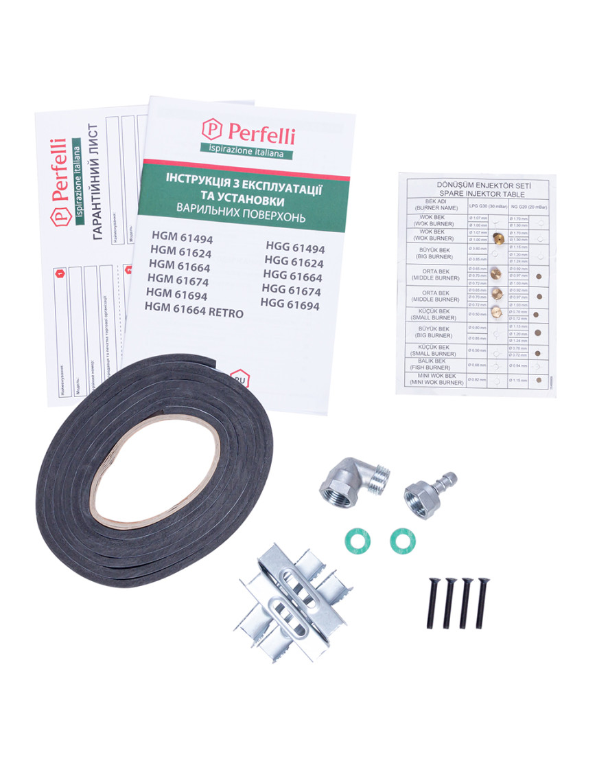 Газовая варочная поверхность Perfelli HGM 61664- идеальное соотношение качественных комплектующих и функциональности. Материал поверхности изготовлен из эмалированного металла. Варочная панель оборудована четырьмя газовыми горелками: одной WOK с мощностью - 3.8 кВт, двумя средней мощности и одной вспомогательной.