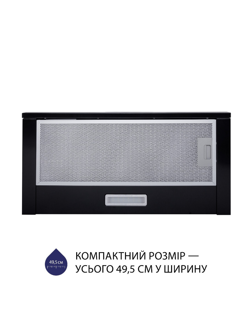 Вытяжка со стандартной шириной 49.5 см идеально подходит для использования с варочной поверхностью такого же размера, который является универсальным для большинства кухонных помещений.