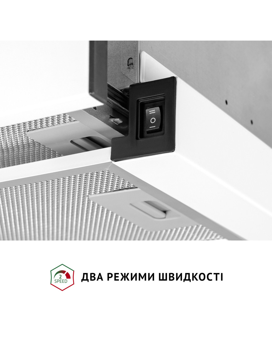 Вытяжка для кухни работает на двух скоростях, что позволяет выбирать нужную интенсивность очистки воздуха в зависимости от его загрязненности.