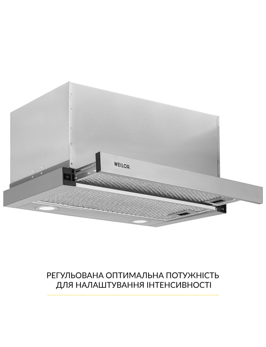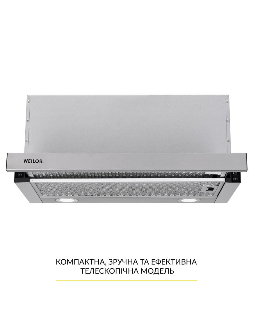 Благодаря великолепной эргономике, которой наделена вытяжка WEILOR WT 67 SS, она подойдет к любой кухне. Дизайн телескопических вытяжек привлекателен за счет простоты и лаконичности. Вытяжка данной модели придаст элегантности вашему интерьеру, а также некоторой утонченности и стиля. Практически весь корпус телескопической вытяжки спрятан внутри навесного модуля, а на виду остается только декоративная выдвижная панель.