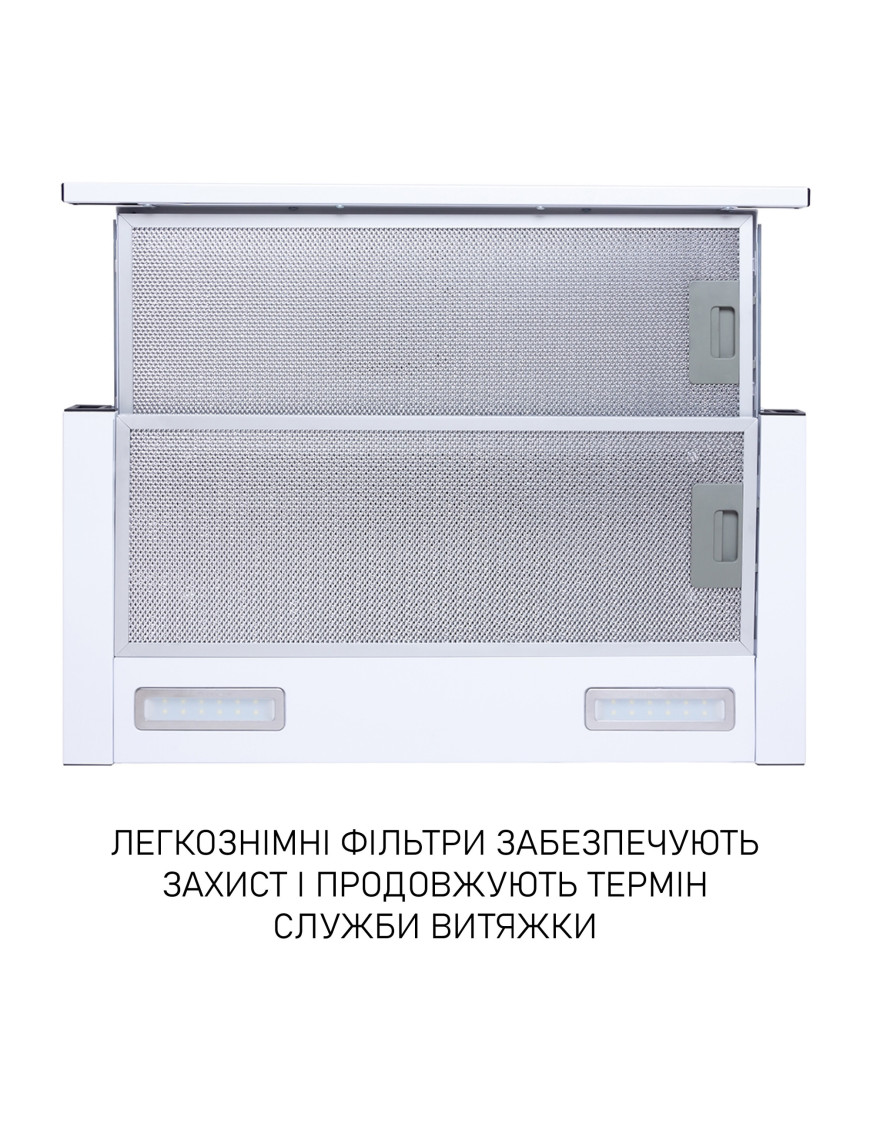 Кухонная вытяжка оборудована двумя алюминиевыми жировыми фильтрами, состоящими из трех слоев. Они обеспечивают надежную защиту двигателя и других деталей устройства от попадания жира и испарений.
