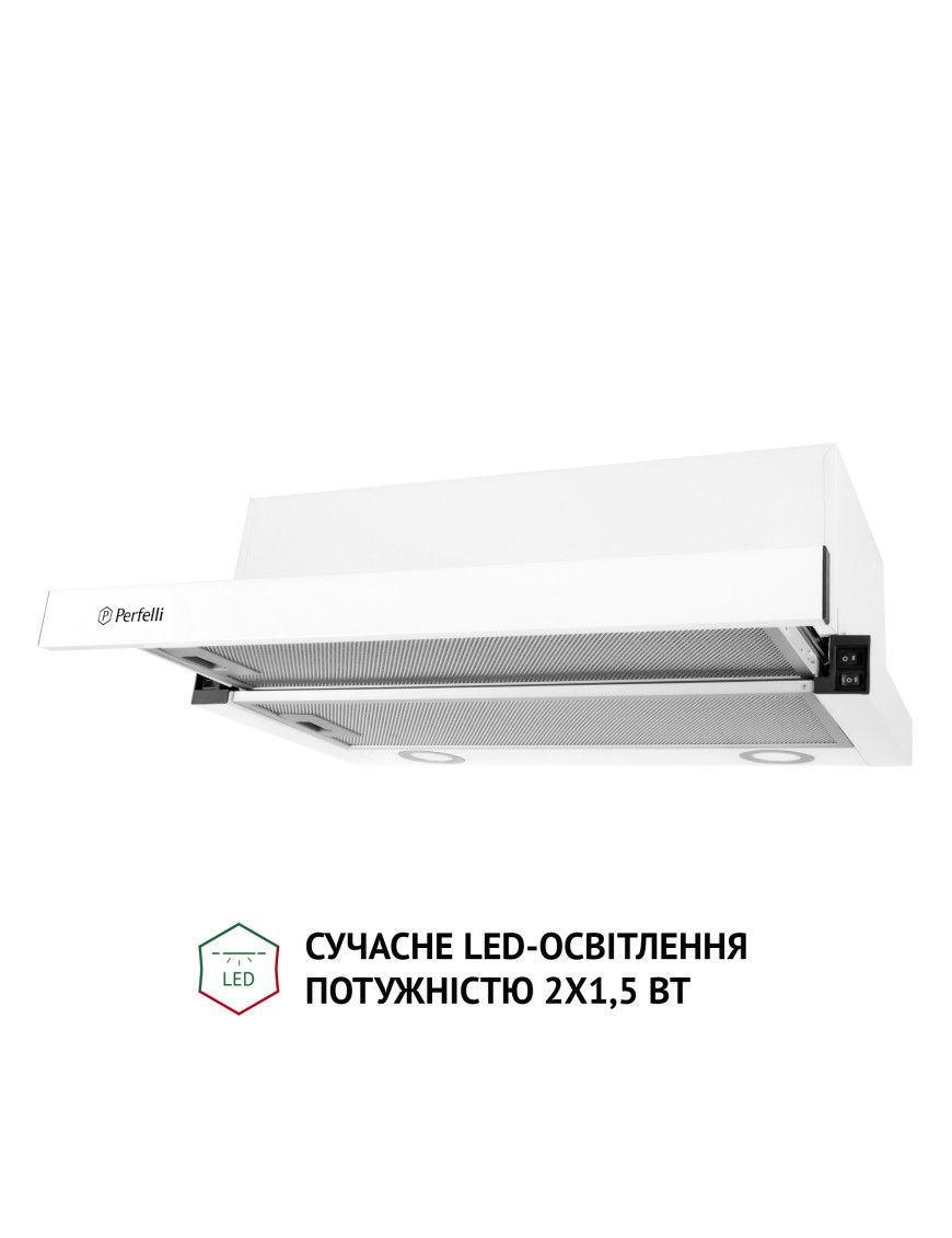 Модель привлекает дизайном и современным подходом в разработке вытяжек для всех, кто желает сделать свою кухню стильной и функциональной Вытяжка с телескопической конструкцией имеет эргономичные свойства, поэтому позволяет рационально использовать пространство в зоне над варочной поверхностью. Выдвижная панель изготовлена из качественного окрашенного металла. Этот материал обладает превосходными эстетическими качествами, устойчивостью к механическим повреждениям и перепадам температур Современные LED-лампы общей мощностью 3 Вт станут дополнительным источником света над варочной поверхностью, если основного недостаточно. Кроме того, светодиоды комфортны для глаз, долговечны и экономны Вытяжка оборудована двумя трехслойными алюминиевыми фильтрами, которые эффективно защищают мотор и другие детали устройства от загрязнения жиром и испарениями. К тому же, они гармонично сочетаются с общим дизайном вытяжки Управлять вытяжкой PERFELLI TL 6212 WH 700 LED - удобно и легко! Механическая панель управления состоит из переключателей скоростей и включения/выключения освещения. Практичное расположение переключателей на передней панели по бокам позволит осуществлять быстрые манипуляции с устройством без лишних усилий