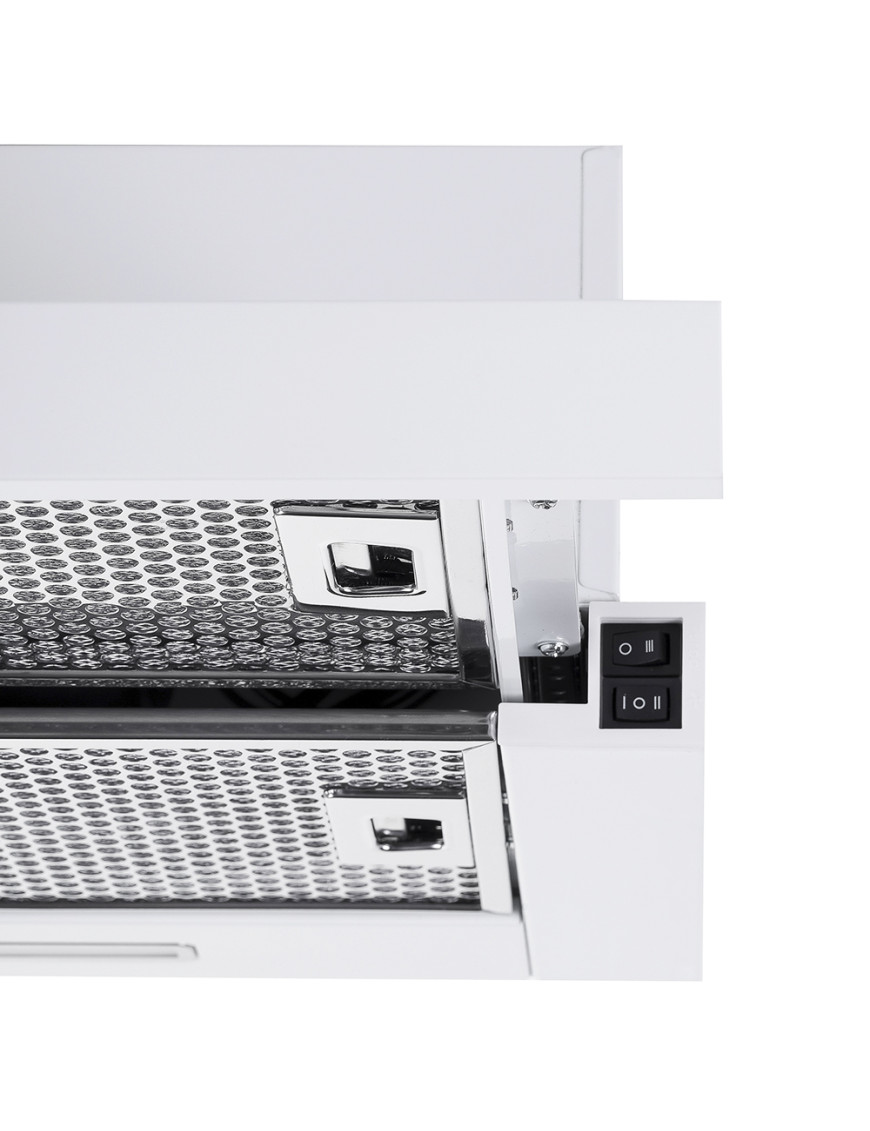 Современный дизайн телескопической вытяжки предназначен для монтажа в нижнюю часть кухонного шкафа таким образом, что в нерабочем состоянии ее конструкция не будет выступать за линию мебели. А во время работы выдвижная панель будет выглядеть, как стильное дополнение к общему дизайну интерьера комнаты. Perfelli TL 5316 WH 700 LED изготовлена в белом цвете и идеально дополнит светлый кухонный гарнитур. Ширина прибора составляет 50 см, что является стандартным размером и подходит для размещения над поверхностями для приготовления пищи с подобным размером.