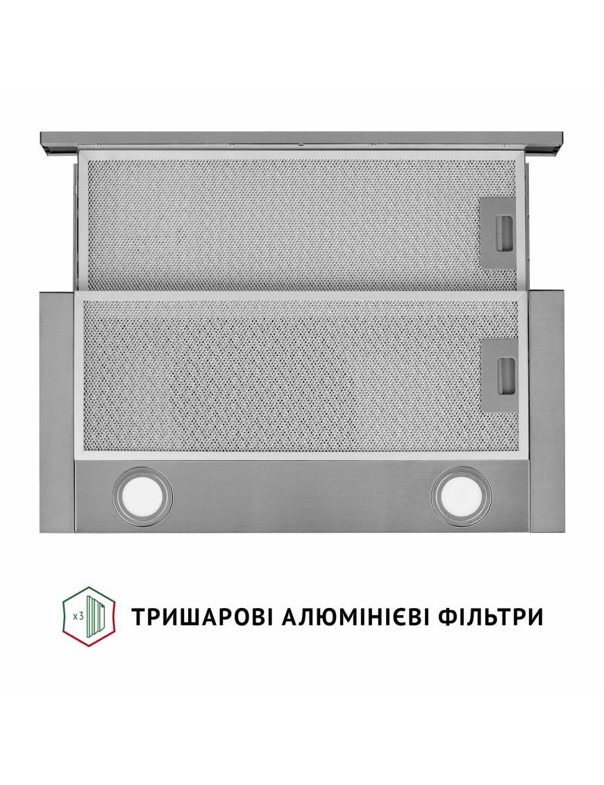 Вытяжка оборудована двумя трехслойными алюминиевыми фильтрами, которые эффективно защищают мотор и другие детали устройства от загрязнения жиром и испарениями. Их можно легко вымыть в теплой мыльной воде или в посудомоечной машине.