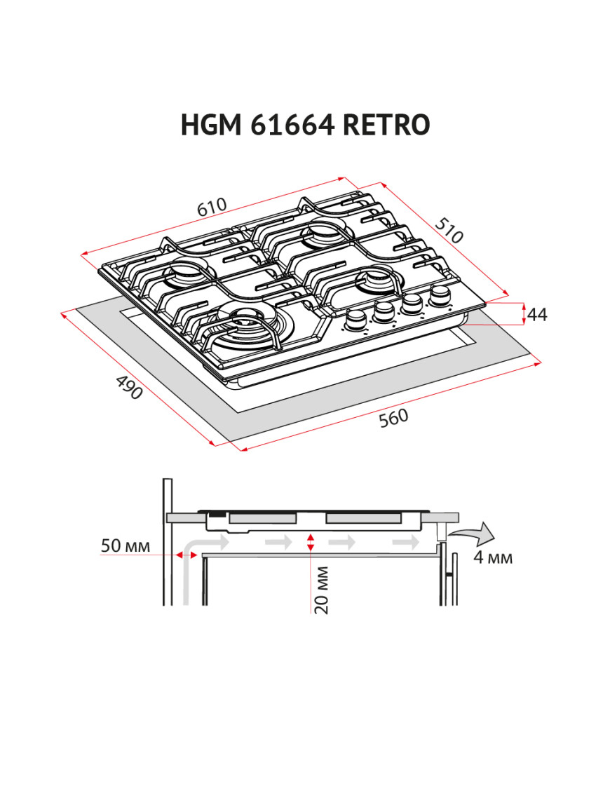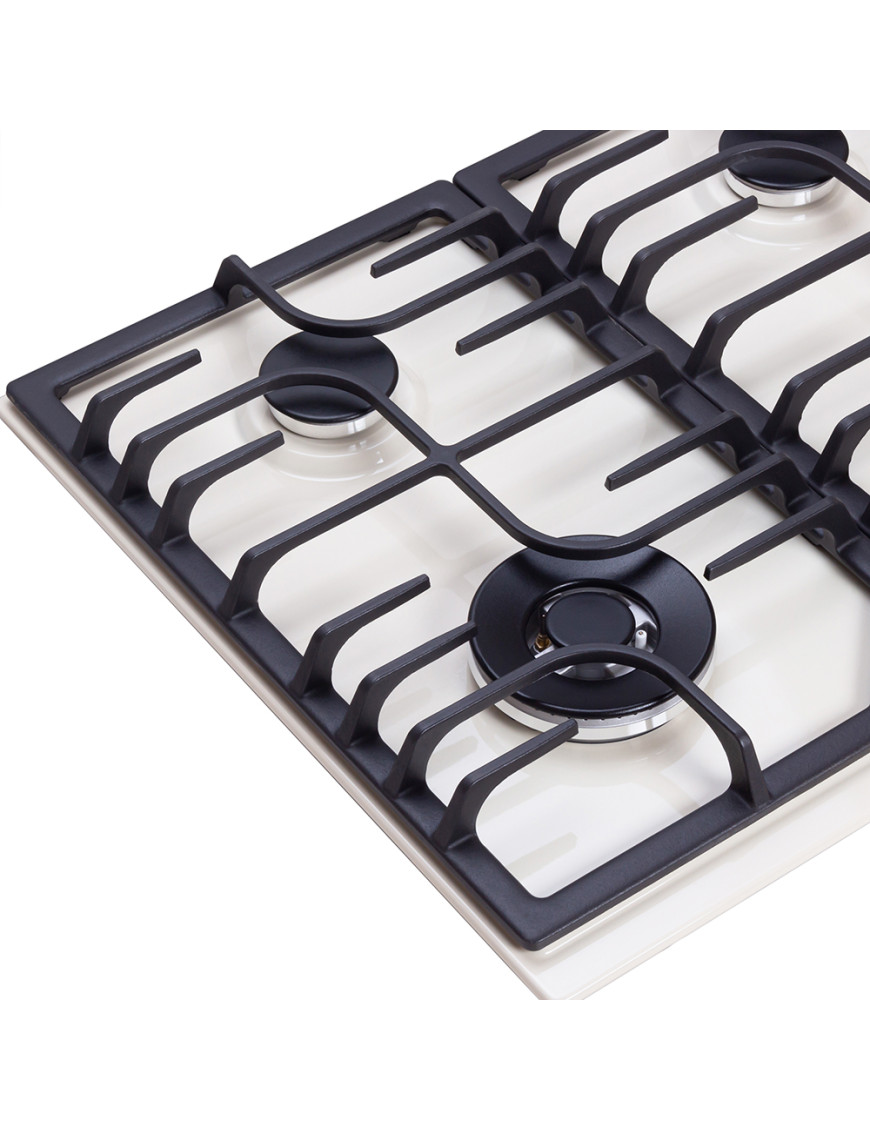 Газовая варочная поверхность, цвет бежевый, материал - эмалированный металл, дизайн - ретро, ширина 61 см, количество газовых конфорок - 4, электроподжиг в ручках управления, газ-контроль, WOK конфорка, чугунные решетки, фронтальная панель управления, переходник на баллонный газ.