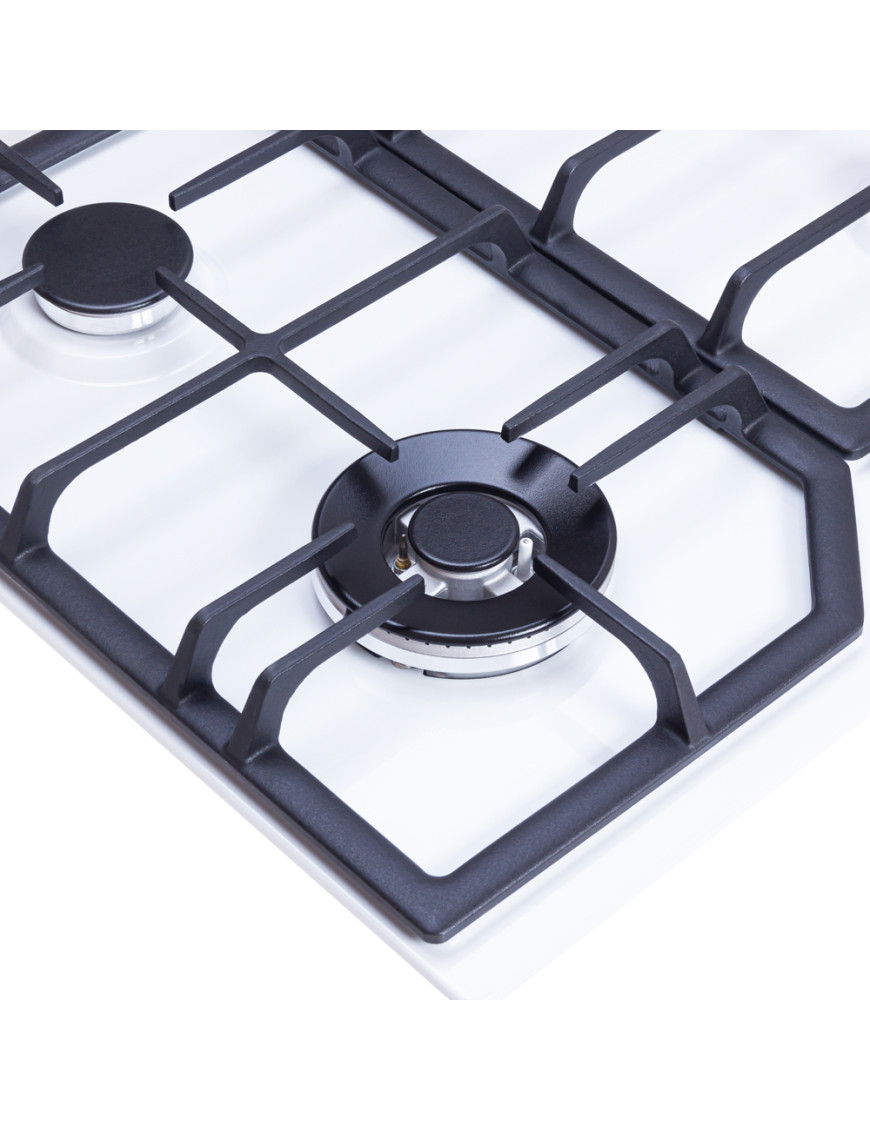 Газовая варочная поверхность, цвет белый, материал - эмалированный металл, ширина 60 см, количество газовых конфорок - 4, электроподжиг в ручках управления, газ-контроль, чугунные решетки, WOK конфорка, фронтальная панель управления, переходник на баллонный газ.