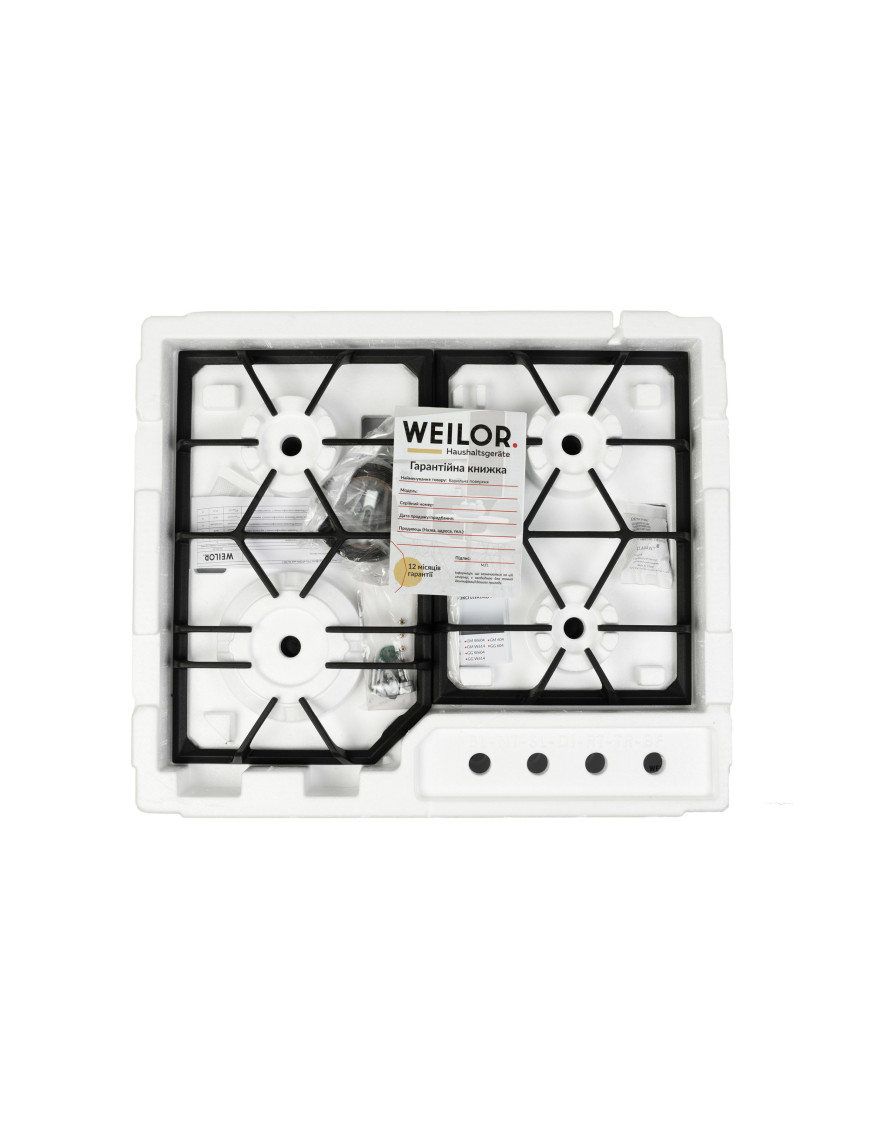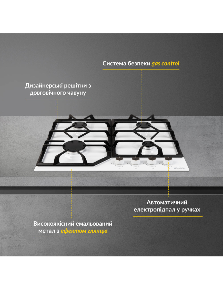 Газовая варочная поверхность на металле от Weilor - символ немецкого качества, функциональности и современности в каждой детали Интересная геометрия решеток из прочного чугуна обеспечивает надежную устойчивость посуды на поверхности. Глянцевый эмалированный металл, кроме стильного вида, отличается устойчивостью к механическим повреждениям и перепадам температур Забудьте о спичках и зажигалках, потому что все варочные поверхности Weilor оборудованы функцией автоматического электроподжига. Чтобы зажечь конфорку, просто нажмите на ручку управления из термостойкого пластика Варочная поверхность оборудована системой защиты газ-контроль, которая автоматически прекращает подачу газа в случае случайного затухания пламени. Это исключает риск утечки газа на вашей кухне Дизайнерские чугунные решетки, стильные ручки управления и глянцевое покрытие, Каждая деталь, изготовленная по немецким стандартам качества, Конфорки, органично расположенные для одновременного выполнения различных задач, Автоматический электроподжиг и газ-контроль - забота о вашей безопасности