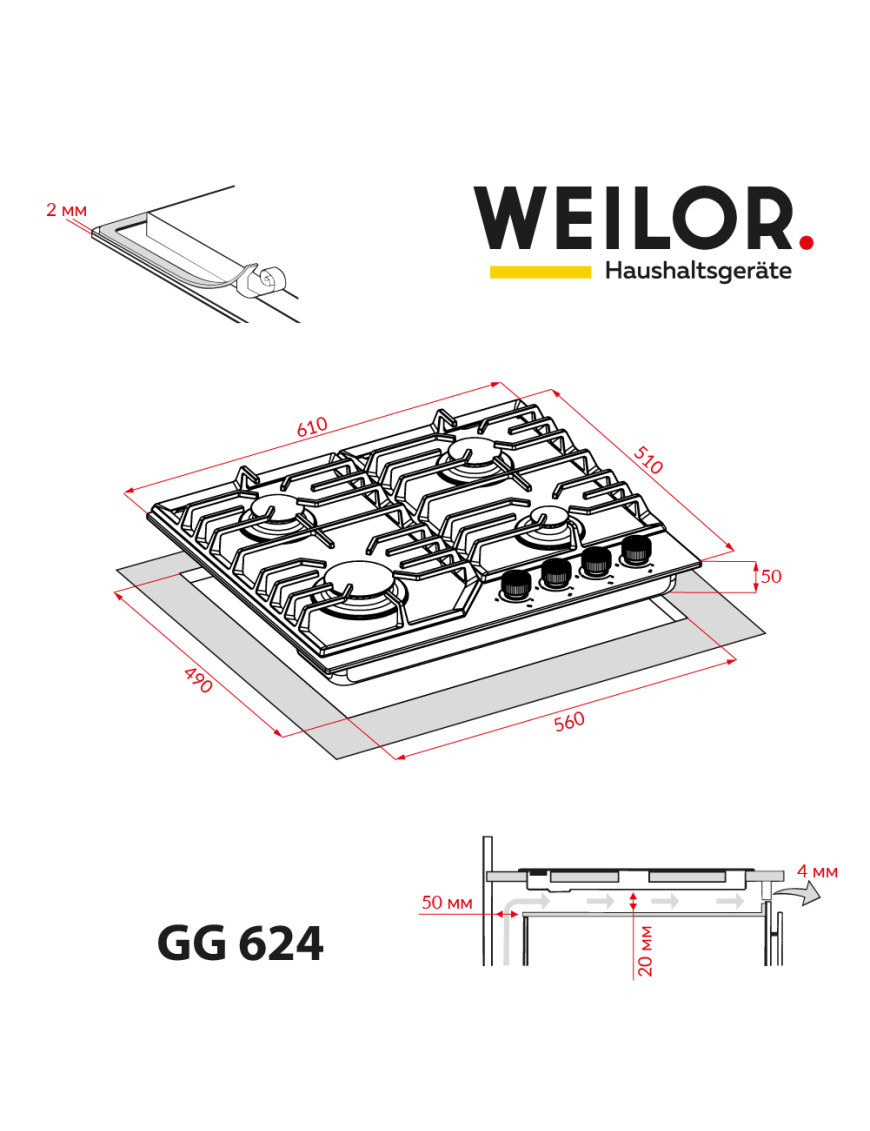 - Варочные поверхности Weilor оснащены системой "газ-контроль", которая автоматически блокирует подачу горючего вещества при отсутствии пламени и обеспечивает максимальную безопасность пользования прибором.
