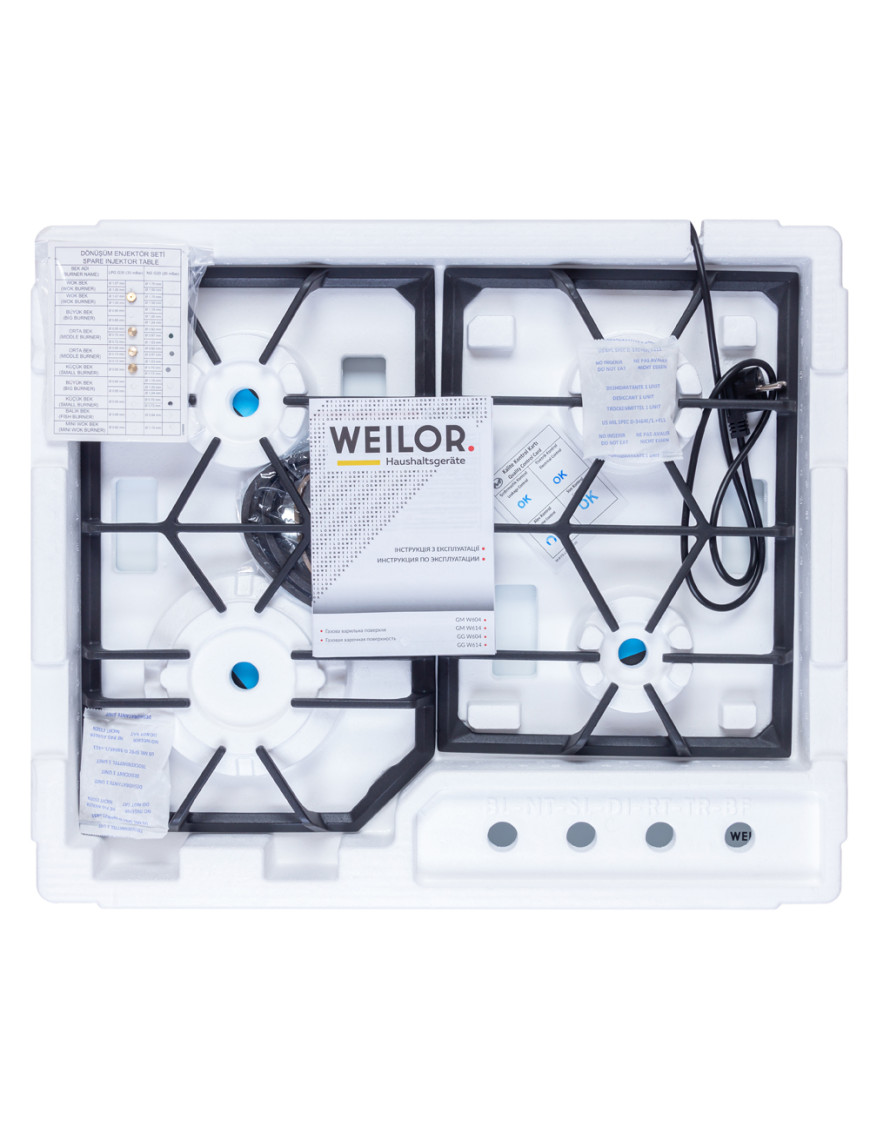 - Варочные поверхности Weilor оснащены системой "газ-контроль", которая автоматически блокирует подачу горючего вещества при отсутствии пламени и обеспечивает максимальную безопасность использования прибора.