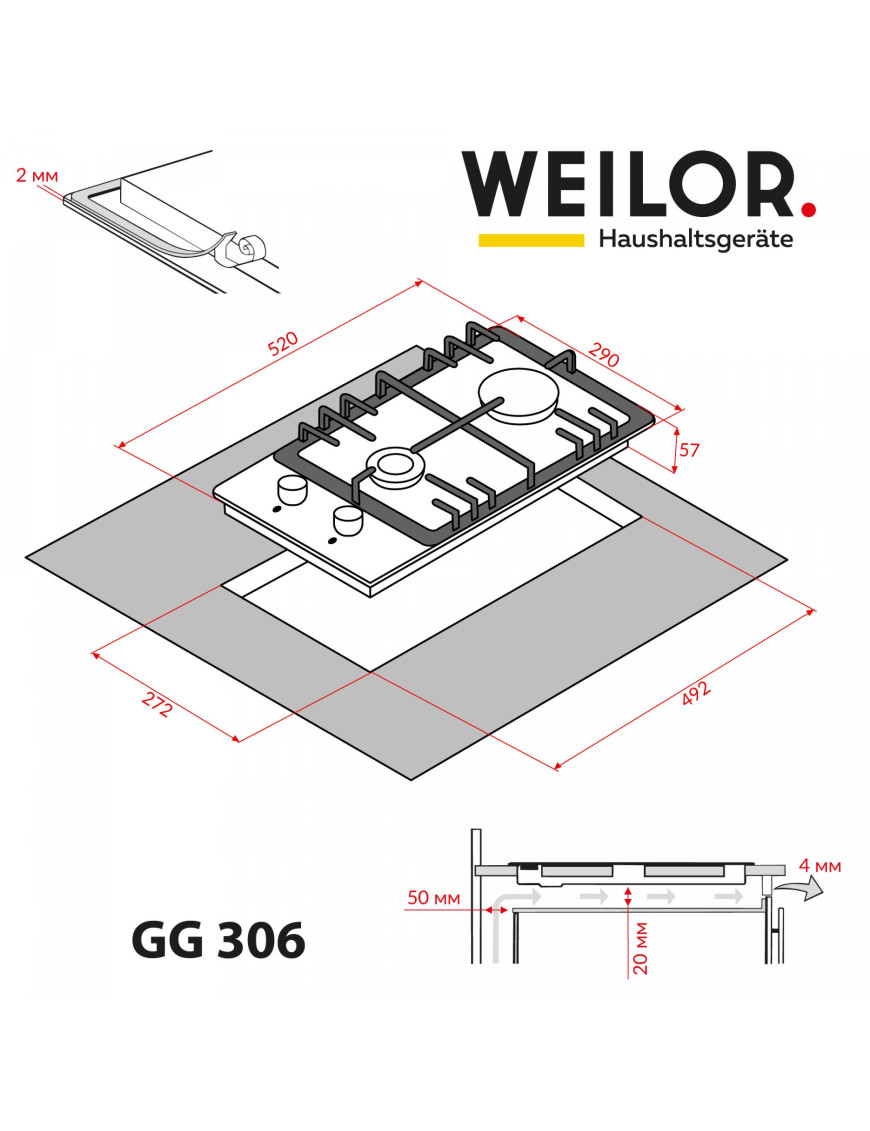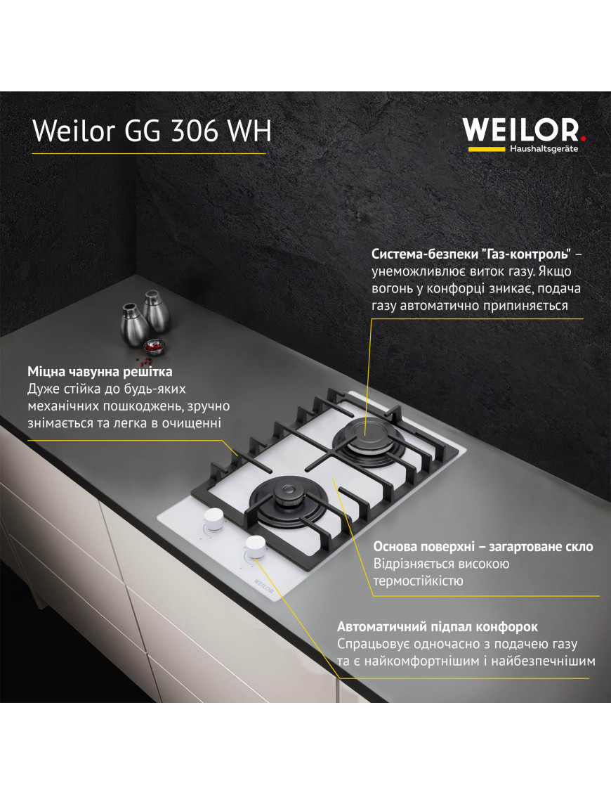 Варильная поверхность WEILOR GG 306 WH оборудована системой безопасности "газ-контроль", которая автоматически блокирует подачу горючего вещества при отсутствии пламени и обеспечивает максимальную безопасность пользования прибором. Данная функция предотвращает утечку газа.